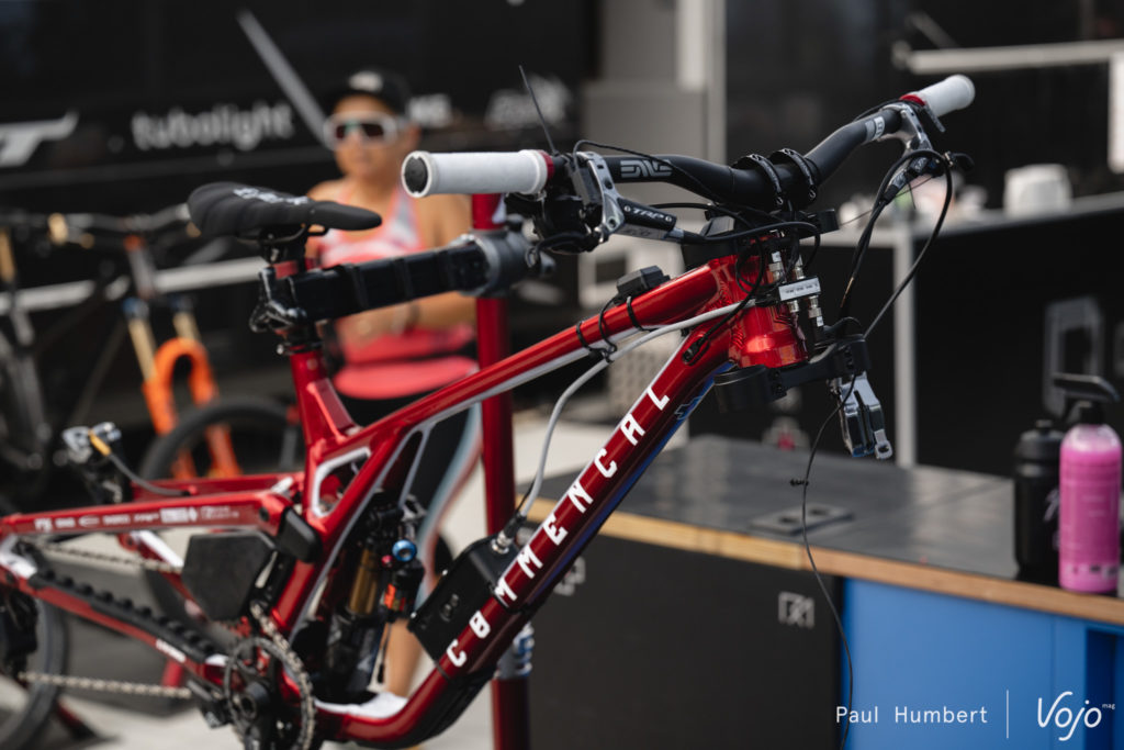 Si les premiers entraînements permettent aux pilotes de prendre la température de la piste, c’est également l’occasion de sortir les kits de télémétrie afin de peaufiner les réglages. Puisque Commencal ne dispose pas de vélo dédié à la télémétrie (contrairement à Specialized), le kit issu de chez BYB se retrouve directement monté sur les vélos fraîchement sortis du carton pour ce week-end.
