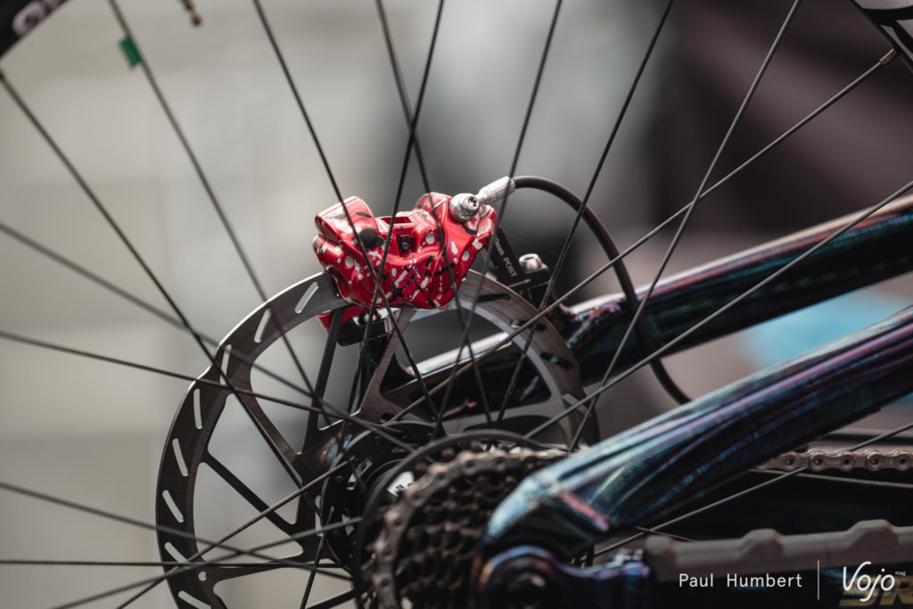 Une fois de plus, les freins sont à l’honneur avec cette paire très atypique. Montés sur le vélo de Davide Palazzari depuis plusieurs mois, ces freins ne ressemblent pas aux freins Braking utilisés habituellement par l’équipe.