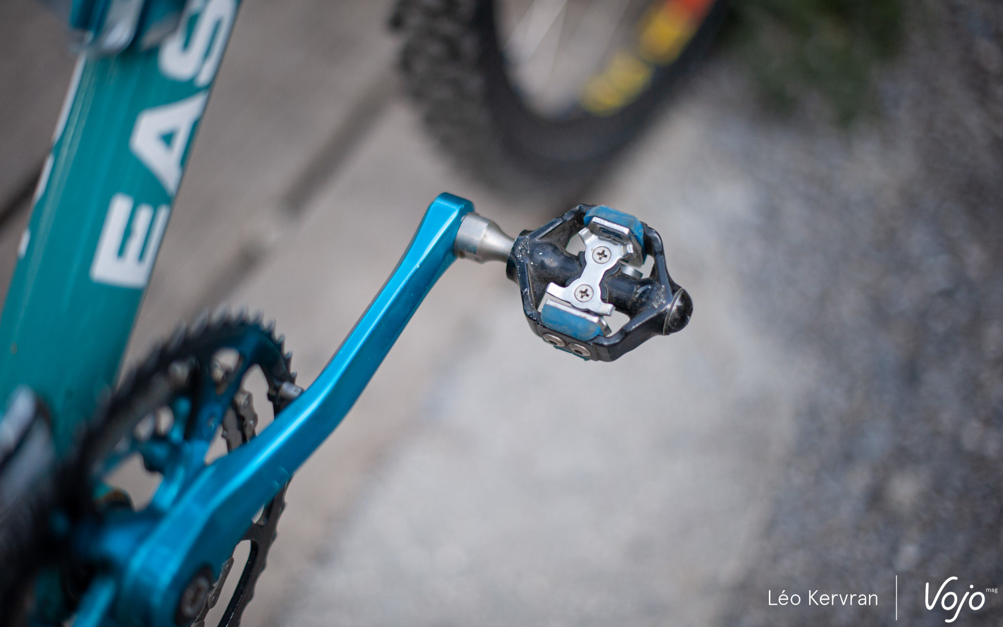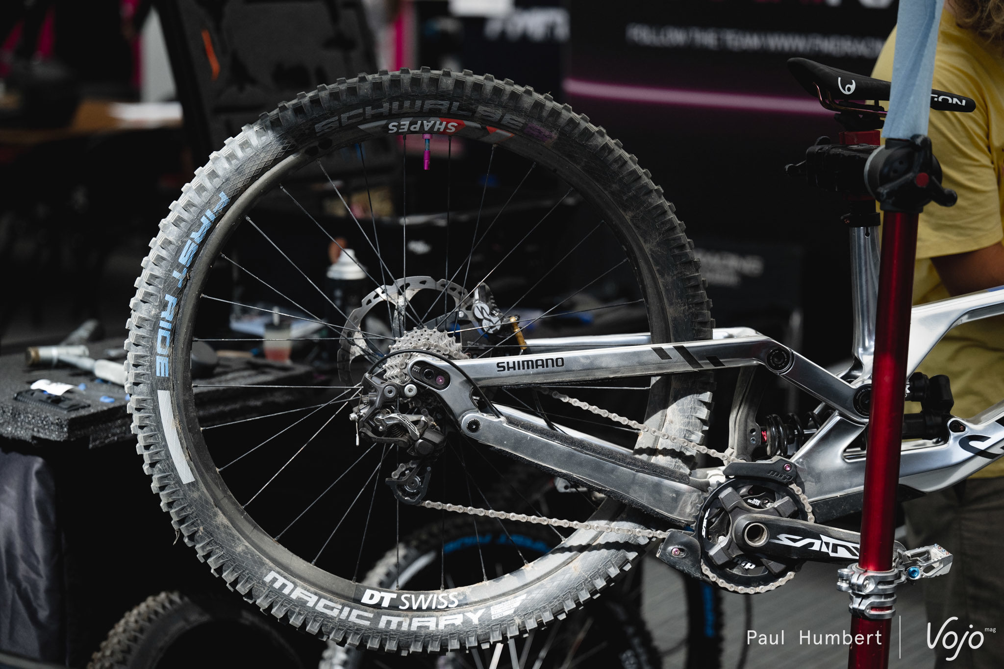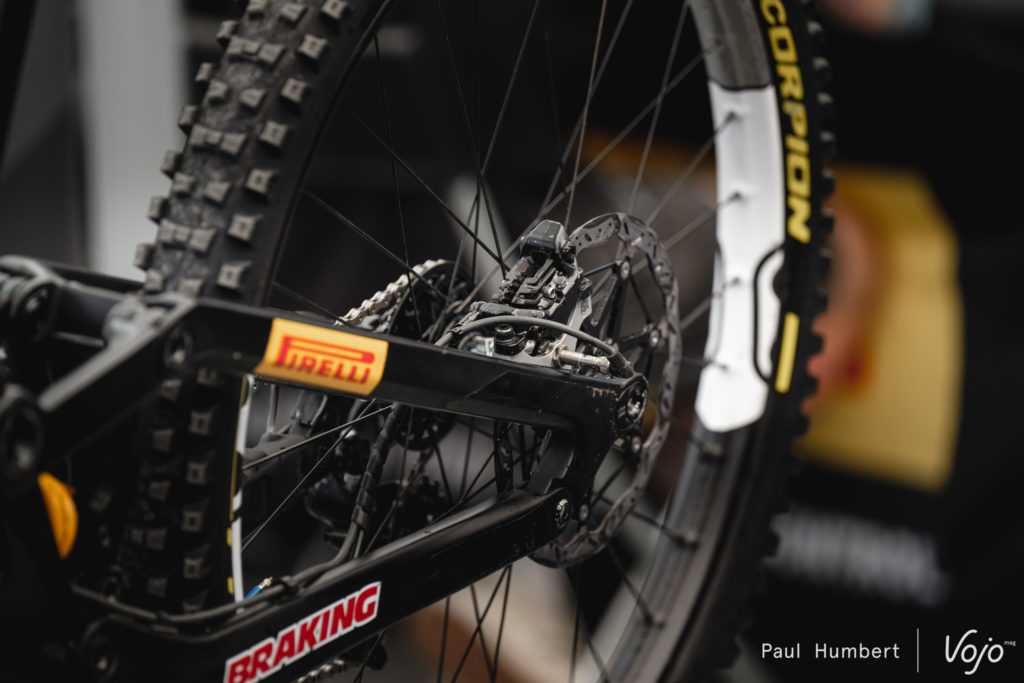 Difficile de faire le tour des paddocks sans remarquer le vélo de Laurie Greenland. Comme les vélos de l’équipe Pivot Factory Racing, la peinture est inspirée du dessin animé Flash McQueen. Si la couleur est quelque peu atypique, le reste est inchangé, on retrouve toujours le même dérailleur prototype de Shimano.