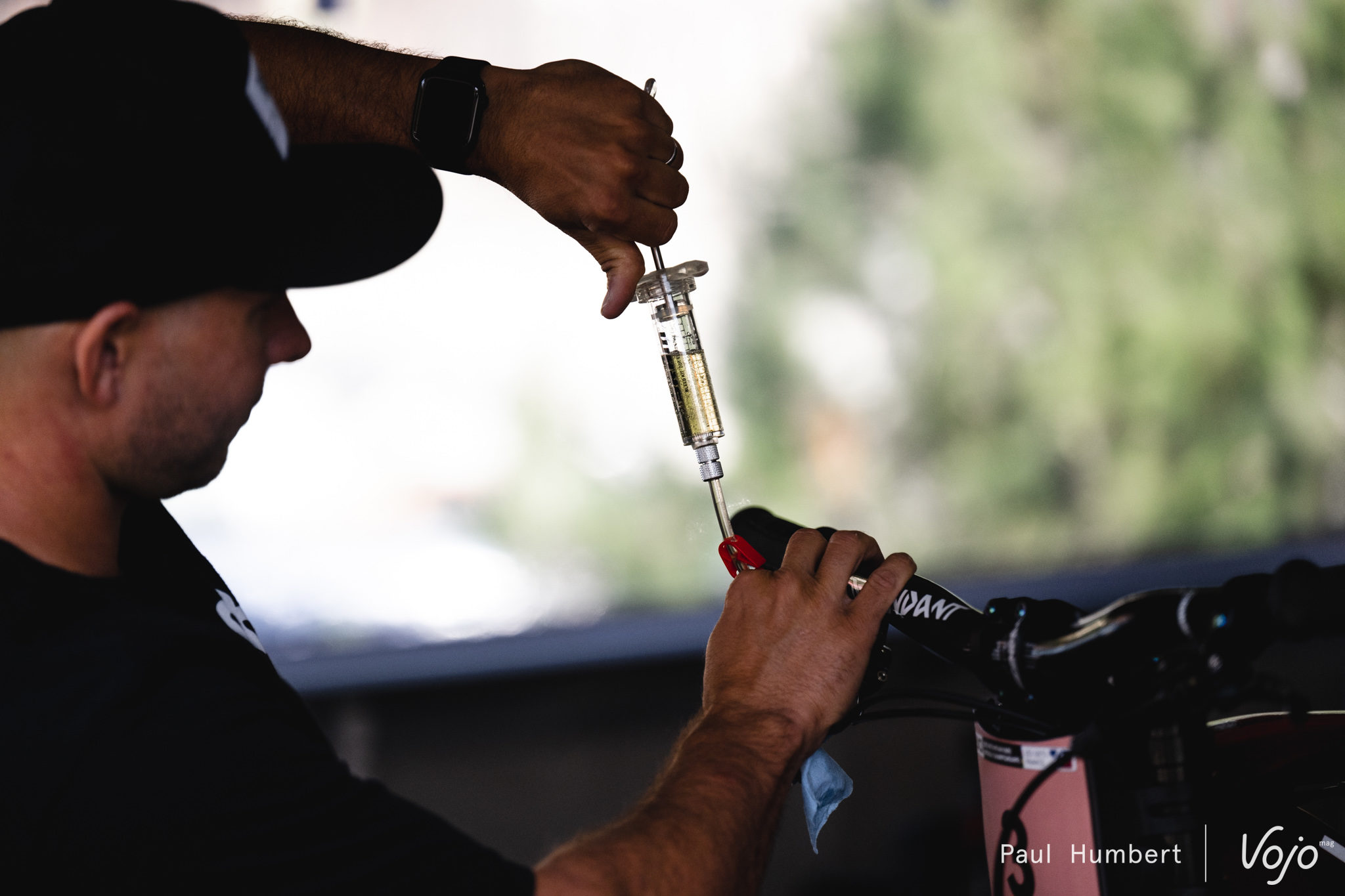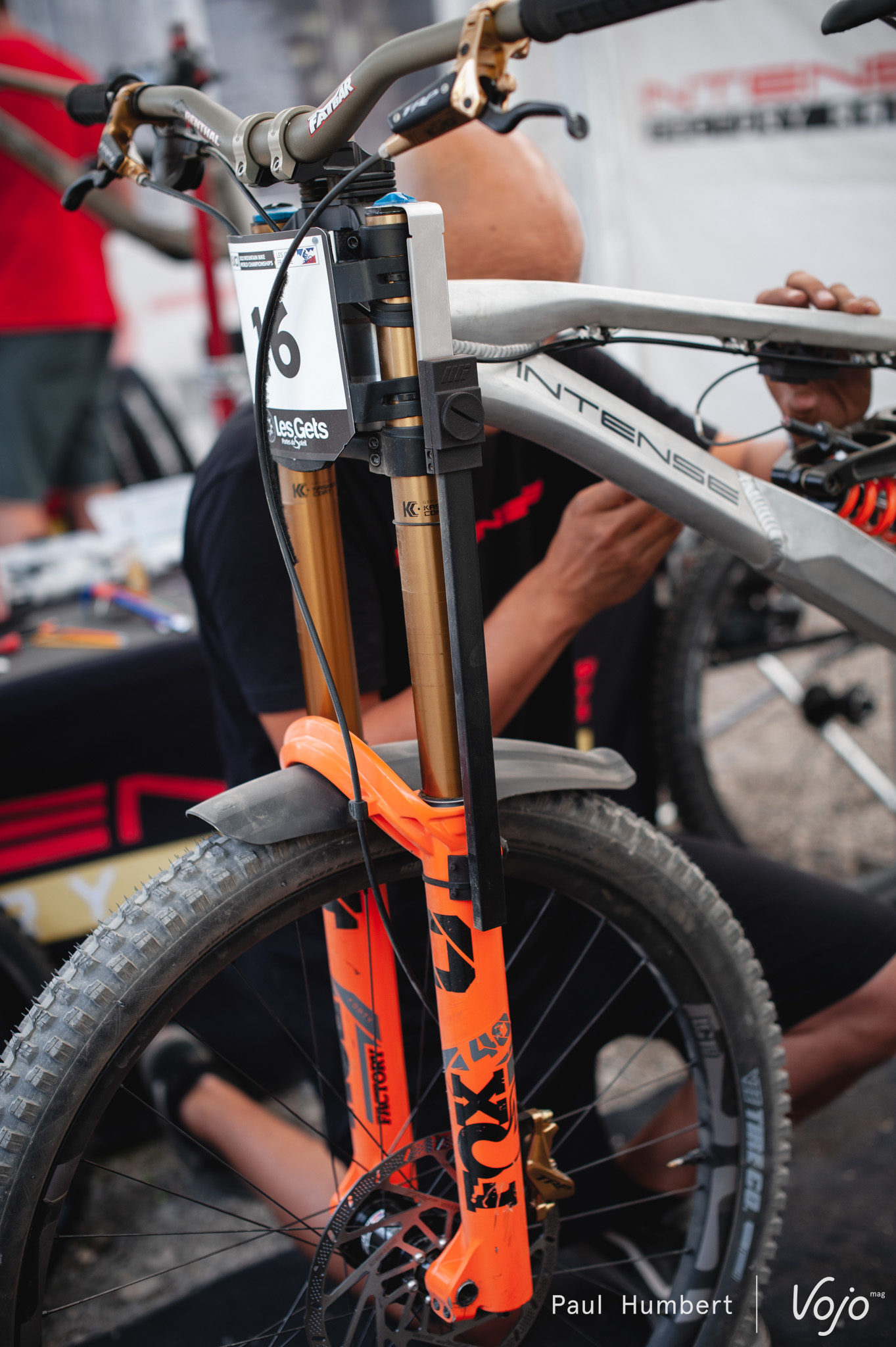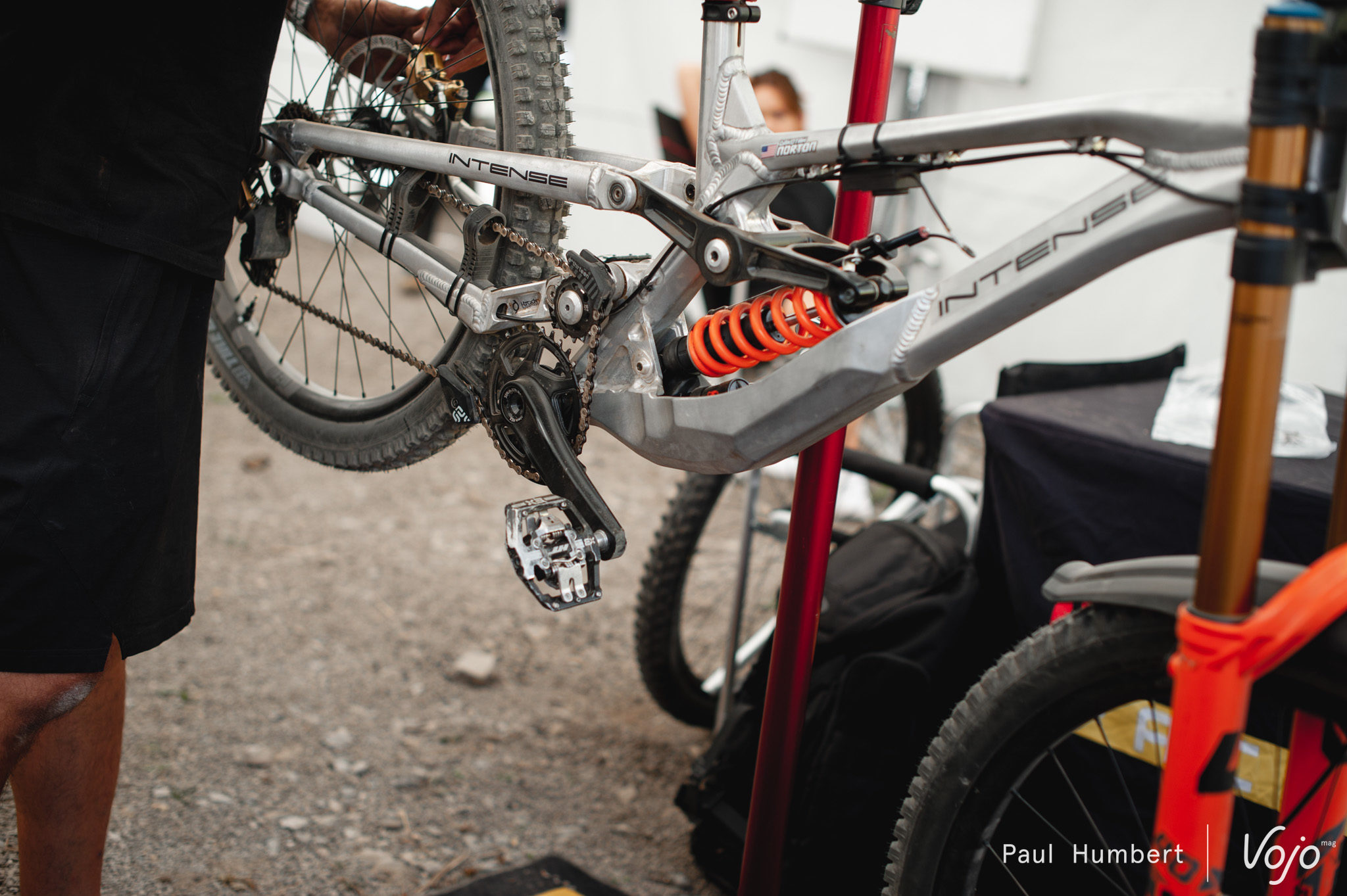 Du côté de chez Intense, les entraînements avaient commencé au moment où nous arrivons sur les stands mais il était déjà temps de procéder à quelques ajustements sur le vélo de Dakotah Norton. On notera le revêtement de la durite, utilisé pour éviter de rayer la plaque.