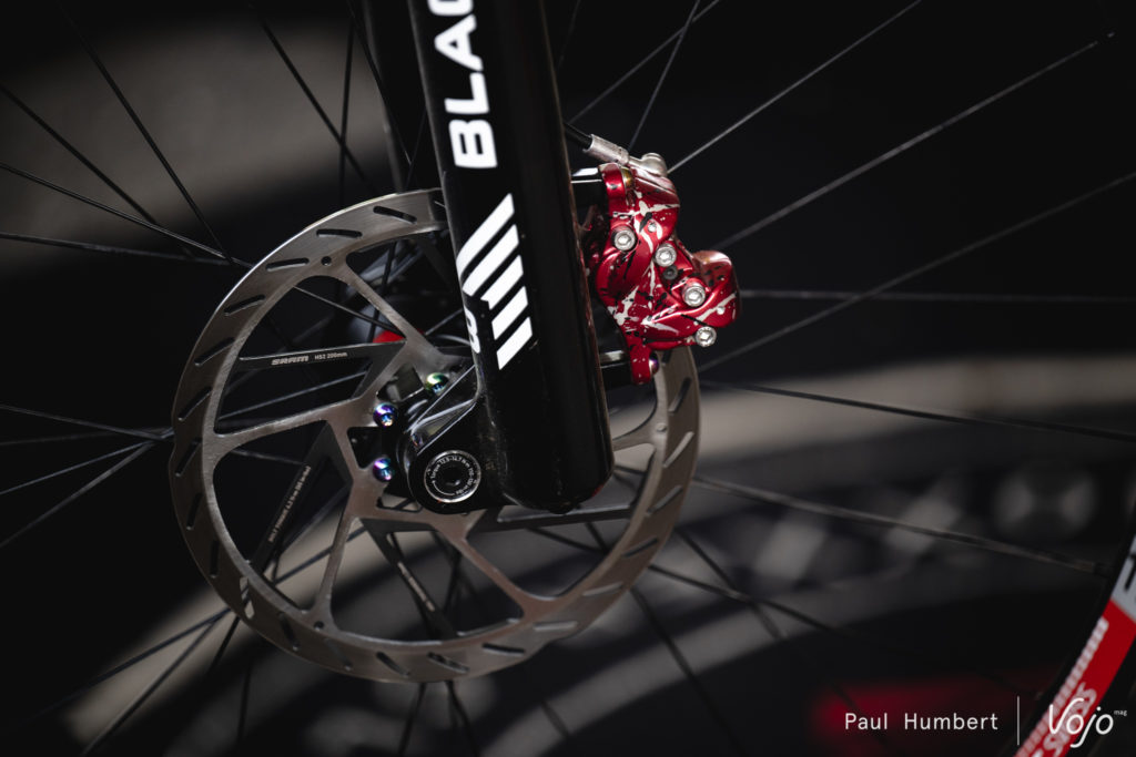 Difficile de dire s’il s’agit d’un camouflage pour dissimuler une autre paire de freins (Shimano à en croire la forme du levier et de l’étrier), ou si l’équipe participe au développement d’un nouveau produit.