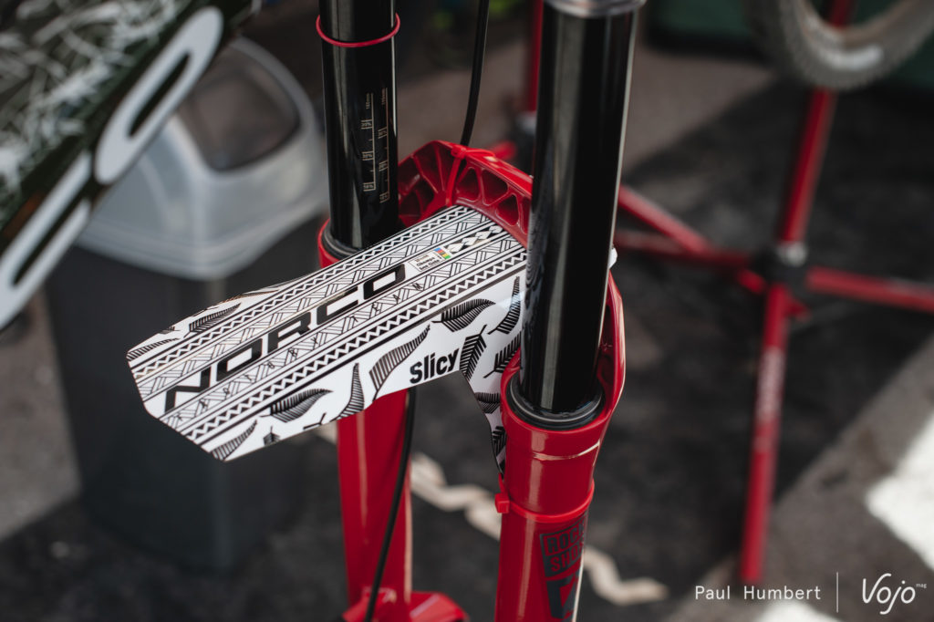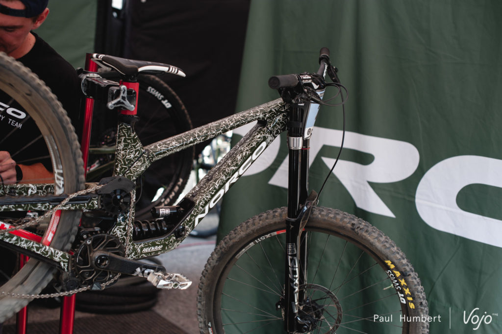 Chez Norco, on n’échappe pas à la tradition de la personnalisation. Au-delà des vélos de Sam Blenkinsop et Gracey Hemstreet, notre œil fut également attiré de l’autre côté du stand par un cadre brut, couleur aluminium. D’après nos informations, Kirk Mcdowall utilisait à Snowshoe un cadre largement recouvert d’une toile. Une fois de plus, nous n’étions pas autorisés à photographier ce qui semble être un prototype.