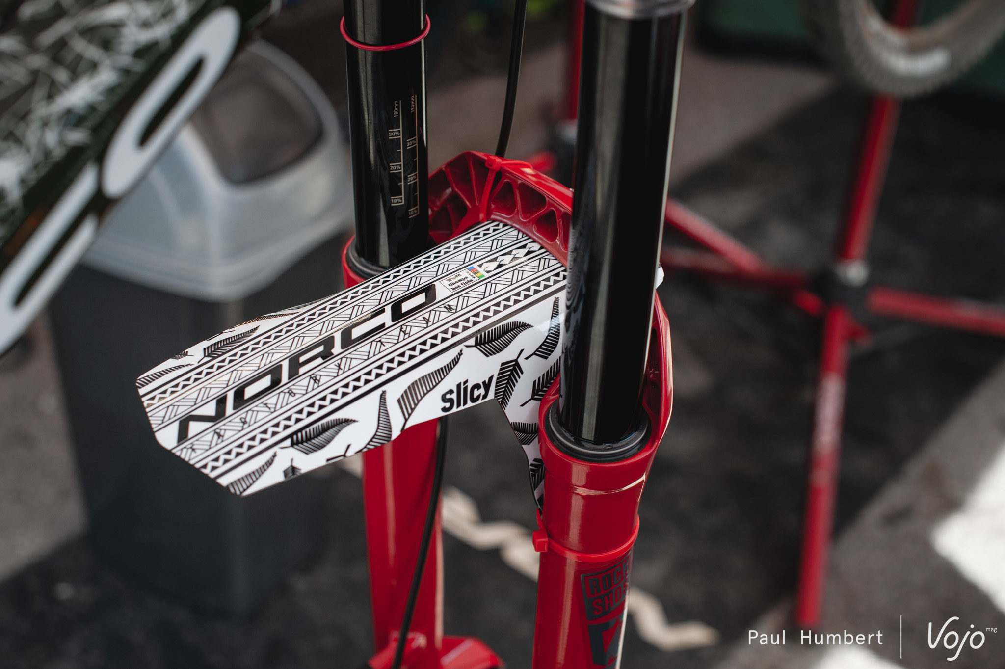 De l’autre côté de la rivière, le vélo de celui qui a déjà remporté quatre fois le maillot arc-en-ciel attend sagement le début des trainings. On y retrouve toujours ce cache noire utilisé pour masquer la tête de l’amortisseur. Un deuxième cache noire est également présent sur la fourche, sur la tête de la cartouche.