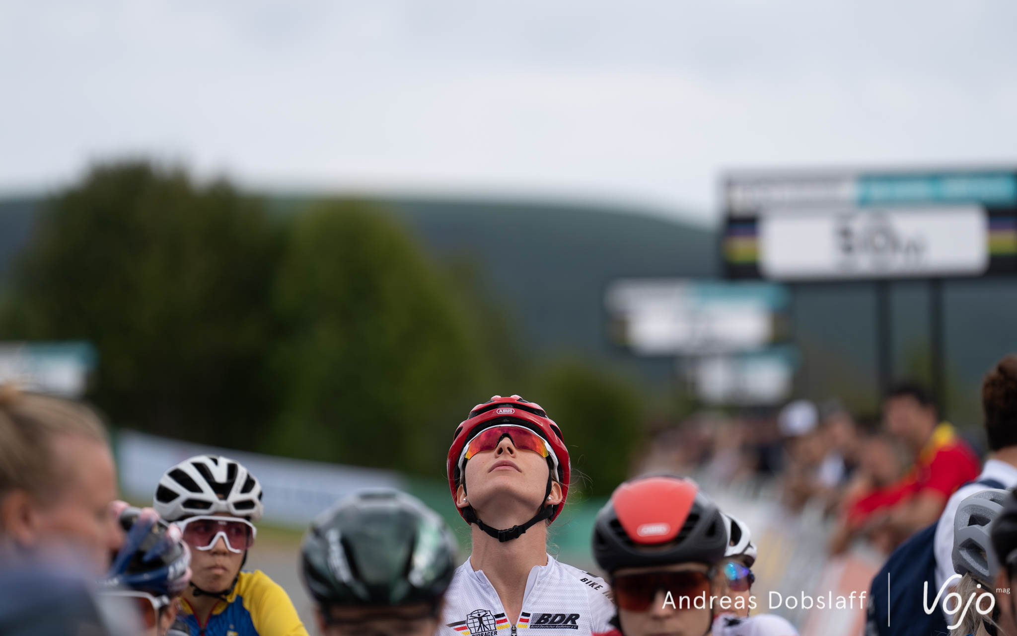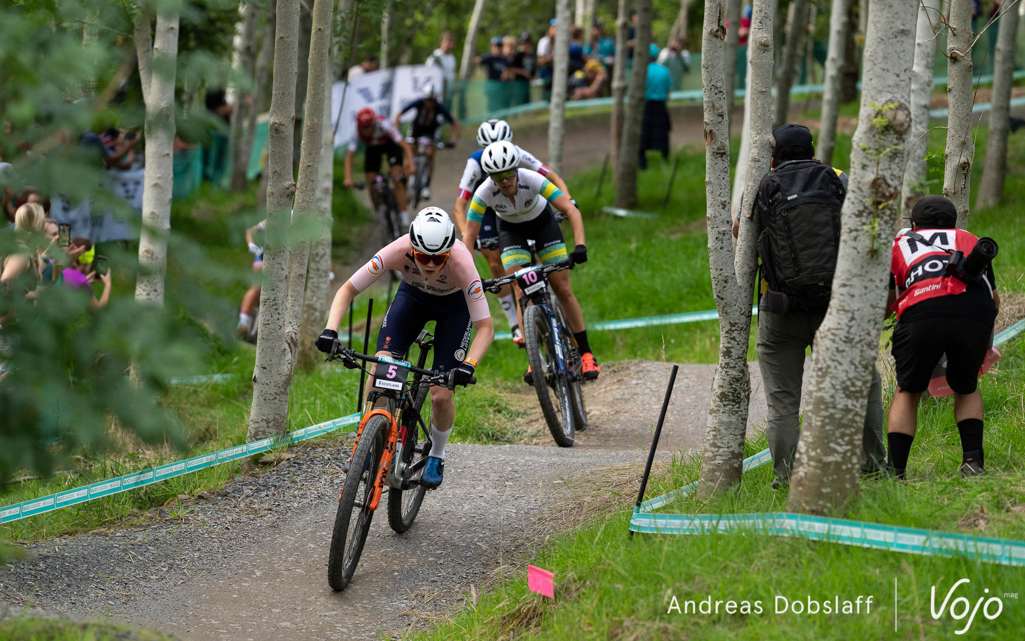 Gonflée à bloc depuis ses performances à Val di Sole il y a un mois, Martina Berta prend le meilleur départ devant Puck Pieterse, Evie Richards et Jolanda Neff. Un peu lente à sortir de la ligne de départ, Pauline Ferrand-Prévot vient très vite se replacer dans sa position préférée c’est-à-dire entre la 2e et la 4e position, en contrôle juste derrière la tête de course.