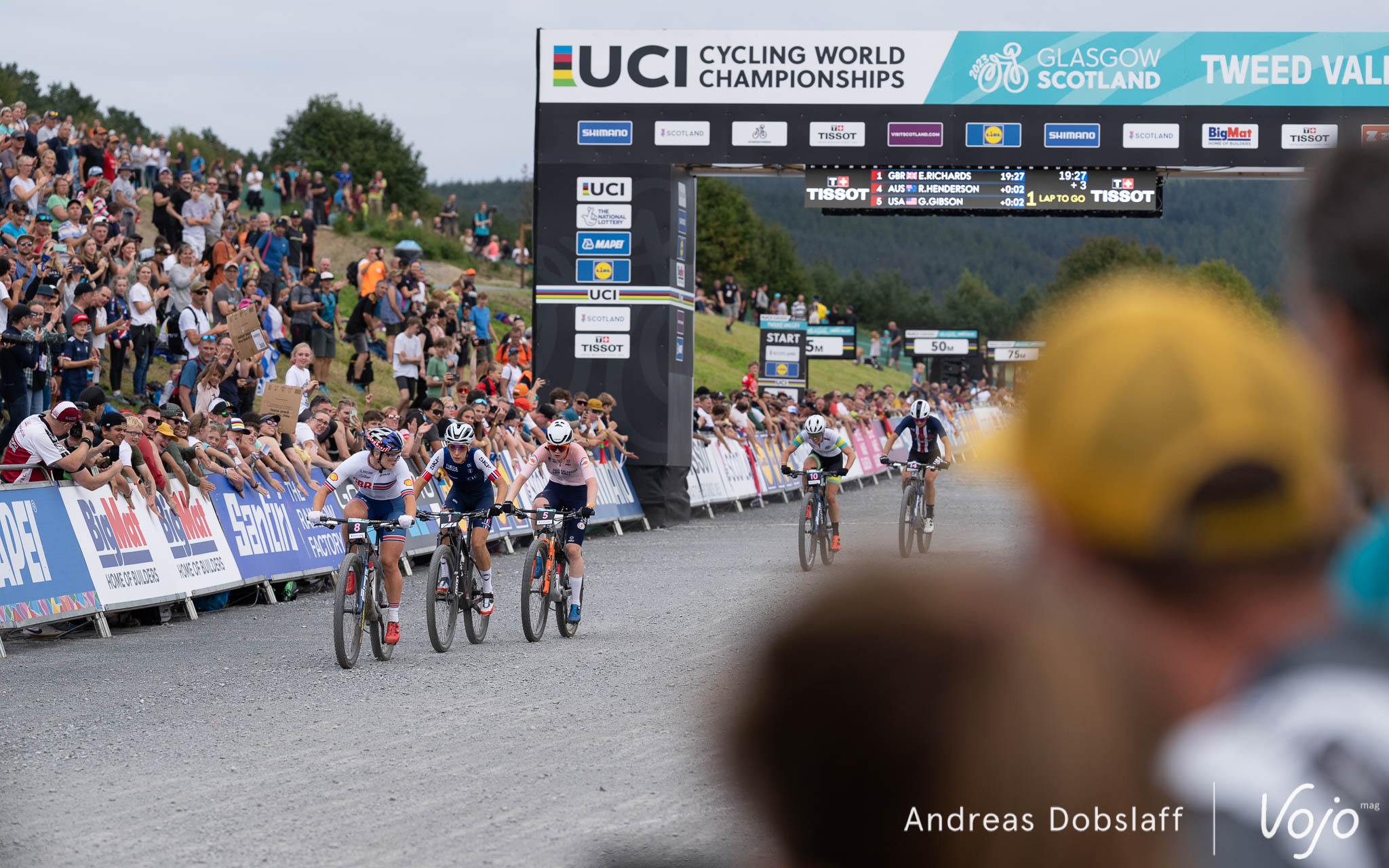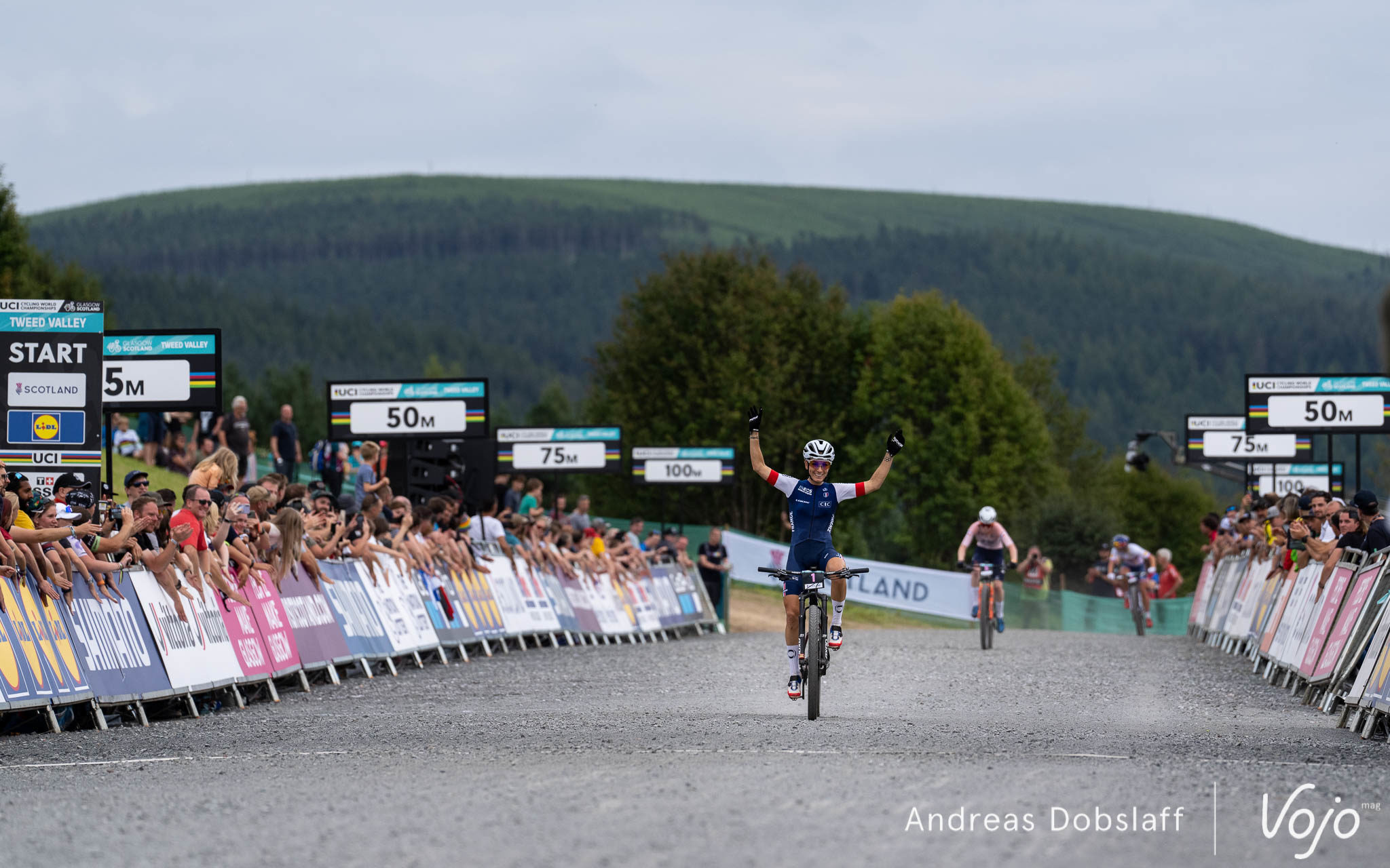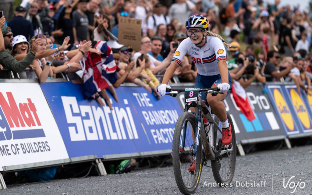 Ne reste plus qu’à rester sur le vélo jusqu’à la ligne, ce qu’elle réussit sans faute, et la voilà championne du monde de XCC pour la deuxième fois d’affilée ! Le tout à l’issue d’une course maîtrisée de main de maître, un véritable récital. De (très) bon augure pour le XCO samedi ! Derrière, Puck Pieterse est parvenue à résister à Evie Richards et prend la deuxième place pour ses premiers mondiaux chez les Elites (alors qu’elle n’est que Espoir 2e année, elle a fait le choix d’être surclassée) tandis que la Britannique termine cette première épreuve des mondiaux à domicile avec la médaille de bronze.