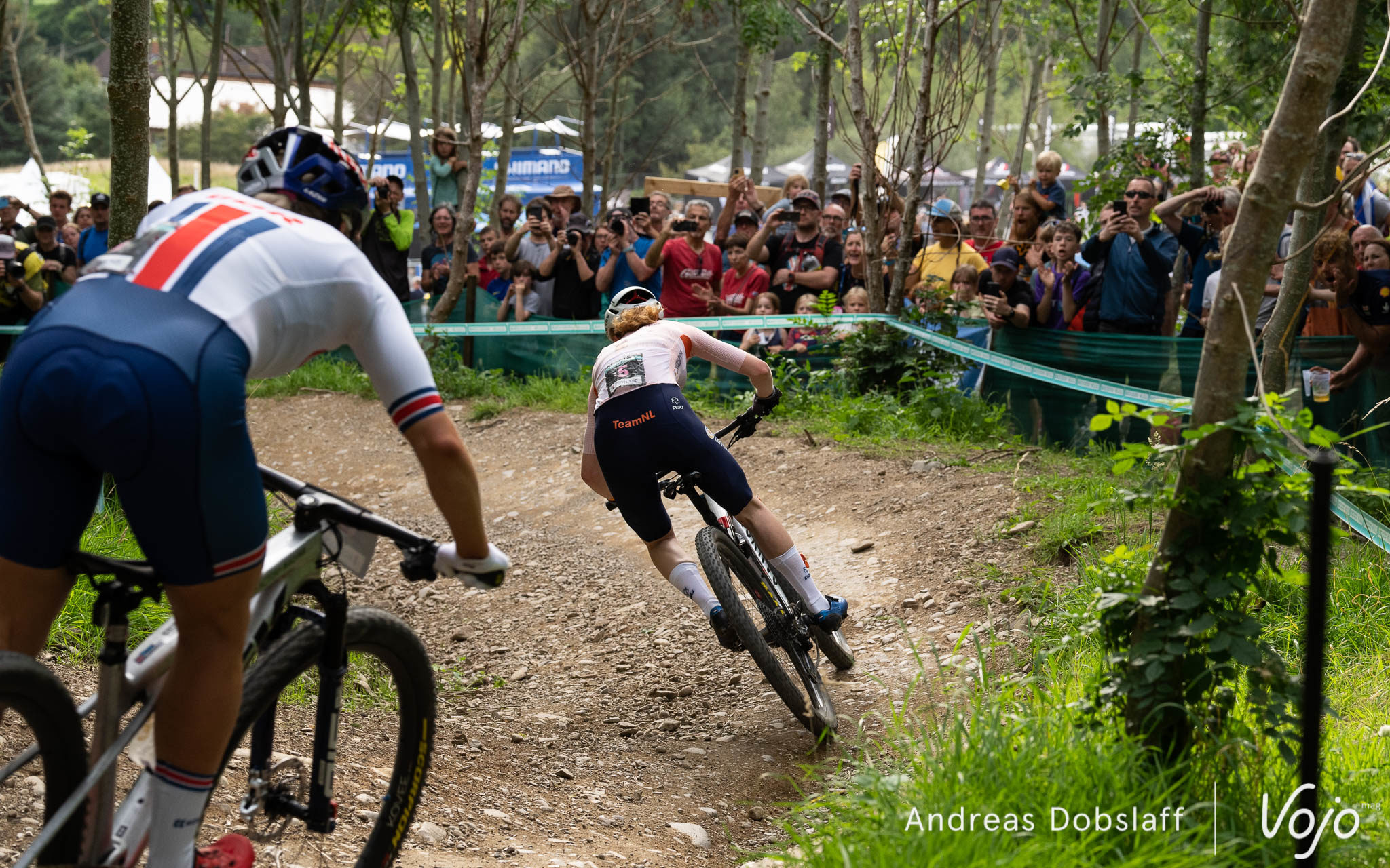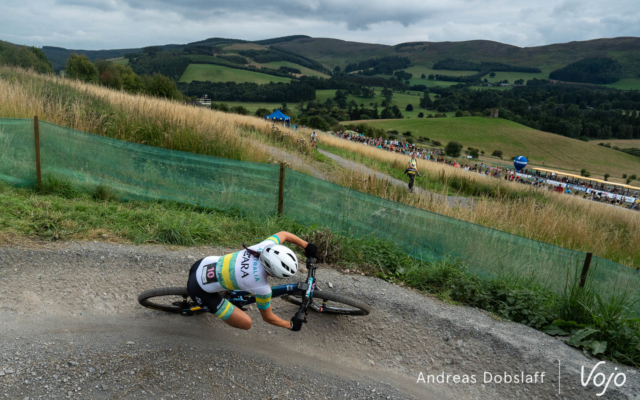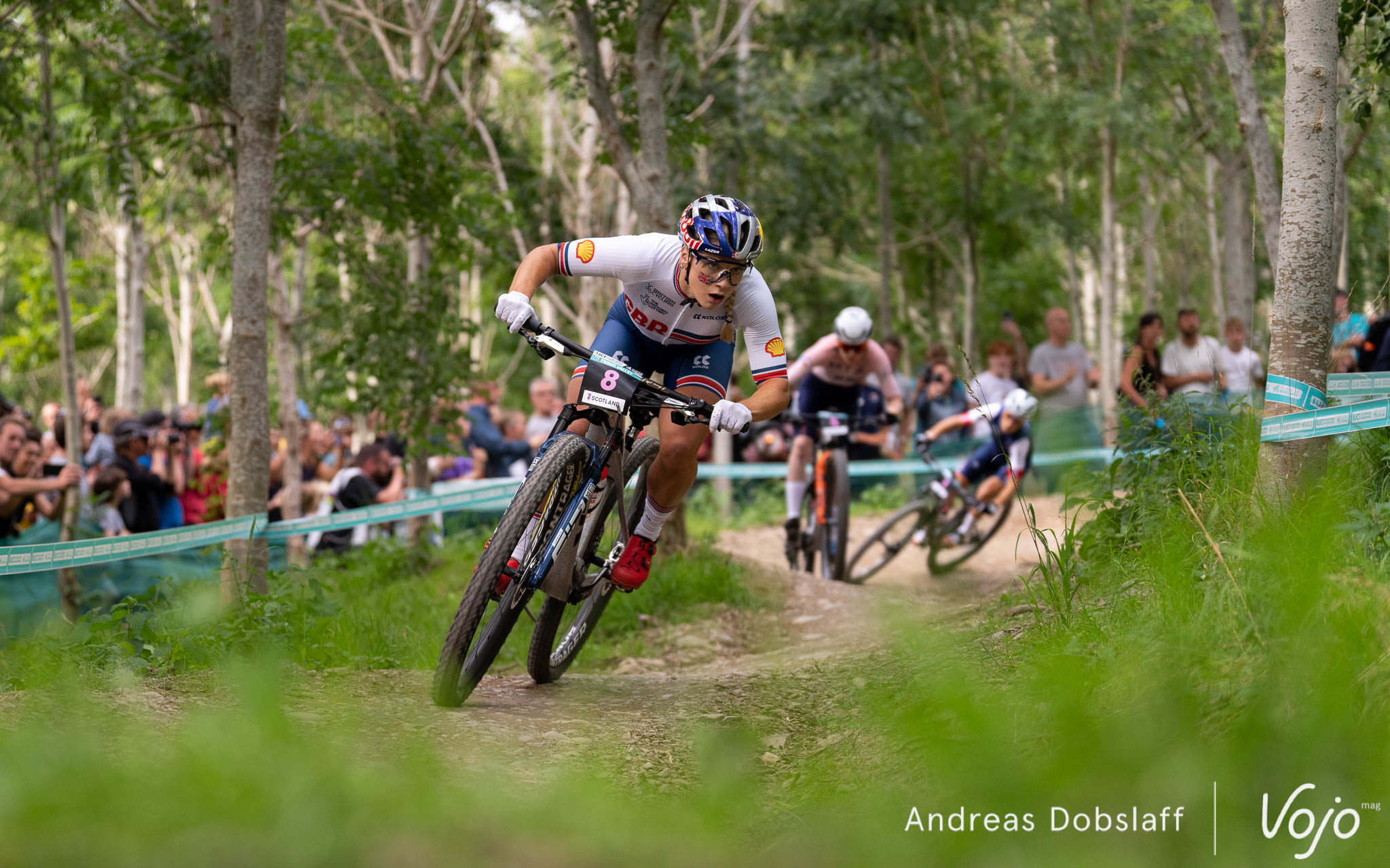 Ne reste plus qu’à rester sur le vélo jusqu’à la ligne, ce qu’elle réussit sans faute, et la voilà championne du monde de XCC pour la deuxième fois d’affilée ! Le tout à l’issue d’une course maîtrisée de main de maître, un véritable récital. De (très) bon augure pour le XCO samedi ! Derrière, Puck Pieterse est parvenue à résister à Evie Richards et prend la deuxième place pour ses premiers mondiaux chez les Elites (alors qu’elle n’est que Espoir 2e année, elle a fait le choix d’être surclassée) tandis que la Britannique termine cette première épreuve des mondiaux à domicile avec la médaille de bronze.