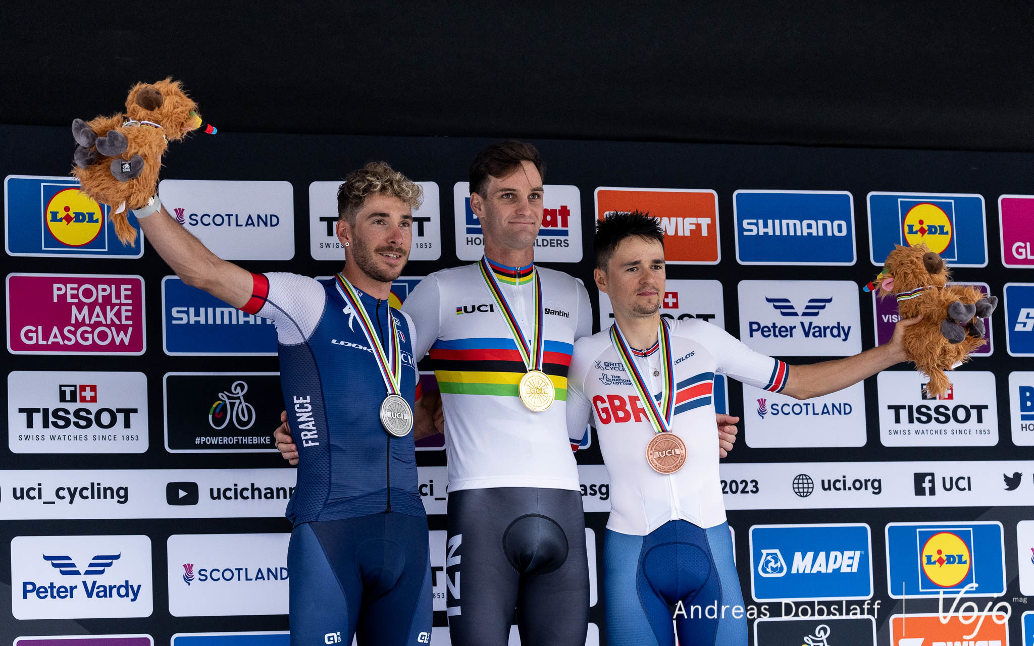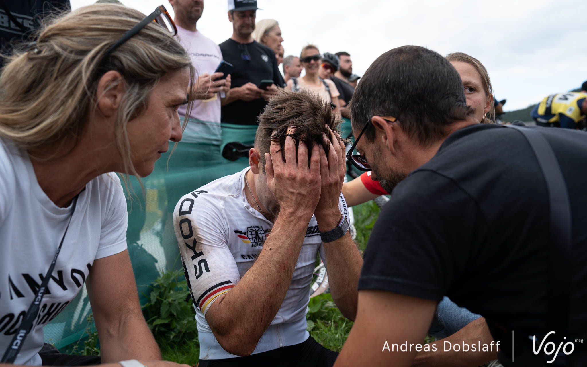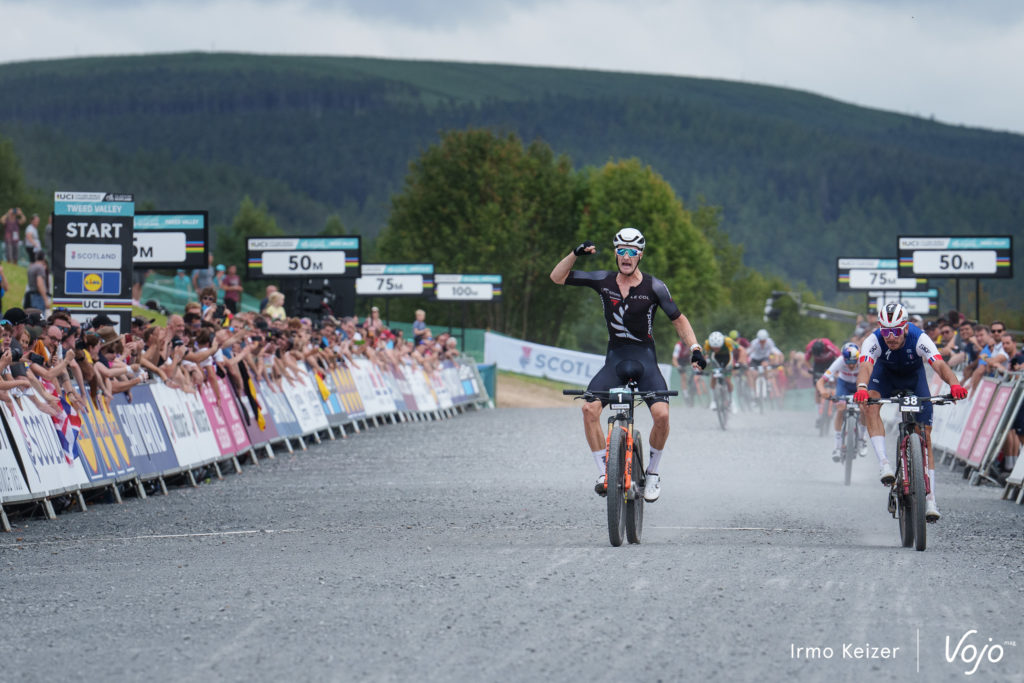 Et dans le dernier virage, l’Allemand oublie de défendre à l’intérieur ! Le Britannique en profite pour plonger dans le virage, l’attaque est virile, les deux pilotes au coude-à-coude… et Schwarzbauer finit par terre. Difficile sur les images de dire si la tentative de Pidcock dépasse les limites ou non mais pour les commissaires cela reste correct et il ne sera pas déclassé. Au final, Sam Gaze s’impose avec une roue d’avance sur Victor Koreztky qui a tenté jusqu’à la ligne tandis que Pidcock prend la médaille de bronze à domicile.