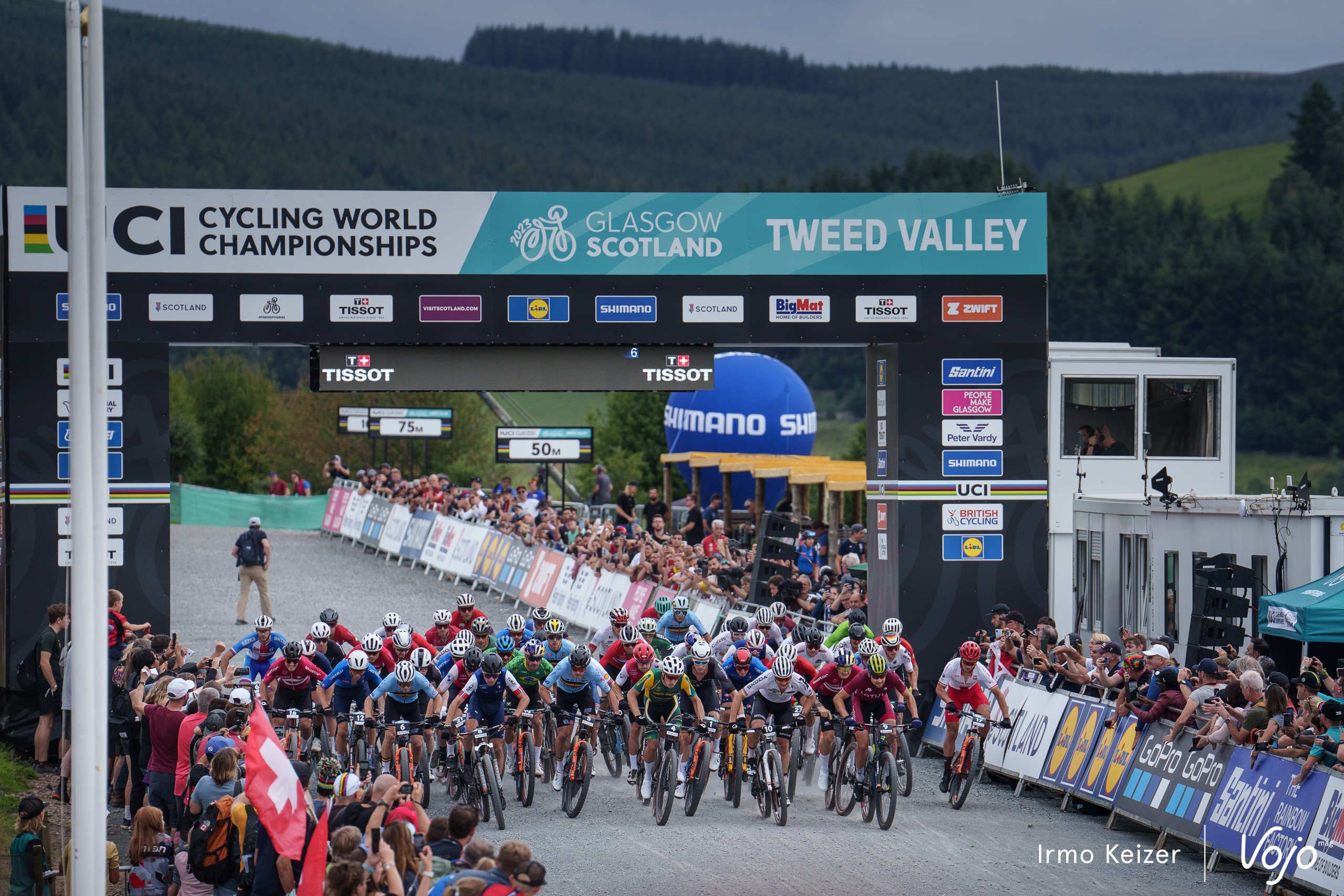 Aux championnats du monde, il n’y a pas de limite au nombre de participants en Short Track comme sur les coupes du monde. En conséquence, la grille de départ était bien fournie ce soir sur le tout nouveau parcours de Glentress, le trail center bien connu au cœur de la Tweed Valley : 75 partants ! Parmi les « nouveaux », sur la dernière ligne du fait de son manque de points UCI en XC, un certain Peter Sagan…