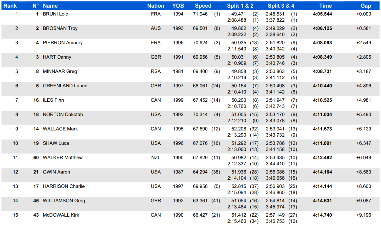La situation se répète avec Troy Brosnan, avant-dernier à s’élancer. Le run est parfait et le résultat cette fois sans appel : Brosnan est quasi 2 secondes devant !