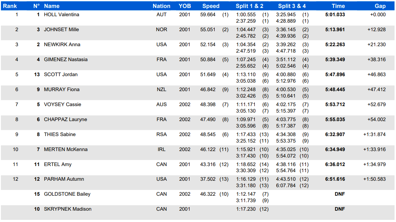 Chez les filles, Vali Höll double la mise et reconduit son titre après sa victoire en 2018. L’Autrichienne aura une dernière occasion d’arborer son maillot arc-en-ciel lors de la finale de la coupe du monde la semaine prochaine à Snowshoe, avant son passage chez les Elites en 2020. Comme d’habitude, ce sont Mille Johnset et Anna Newkirk qui complètent le podium. Les écarts sont énormes, l’une étant reléguée à 12 secondes de Höll et l’autre à 21 secondes ! On notera aussi la belle 4e place de la Française Nastasia Gimenez et la 8e de Lauryne Chappaz.