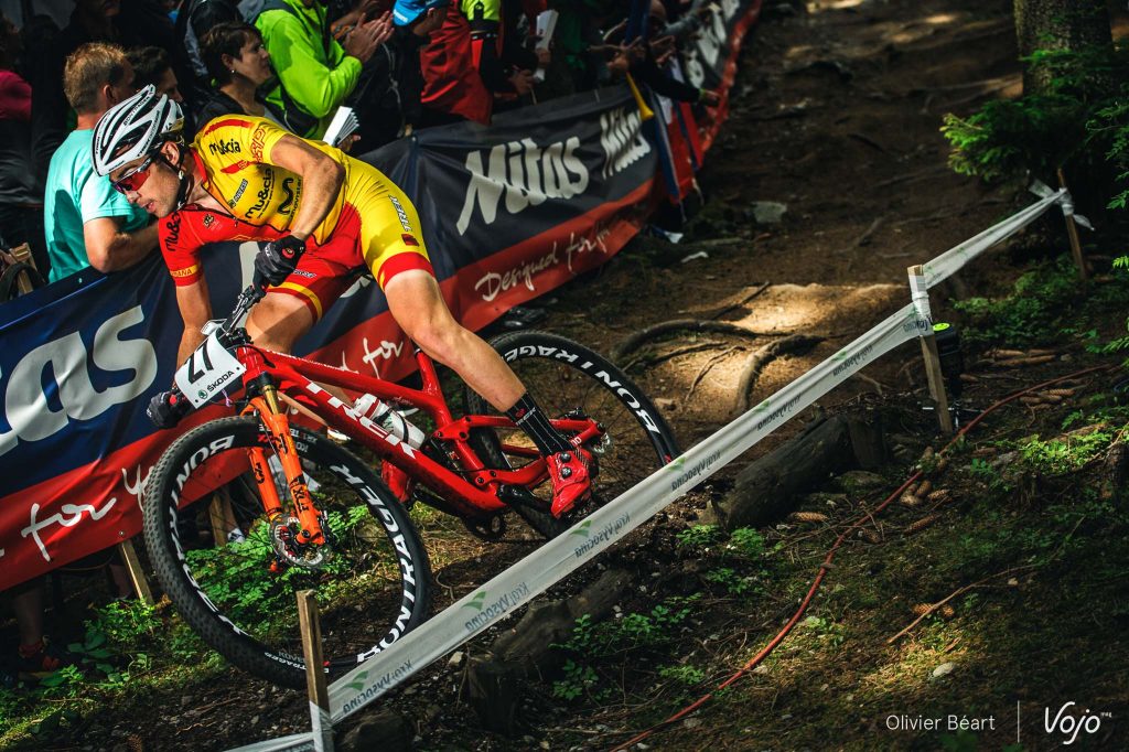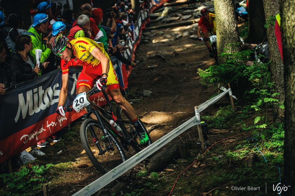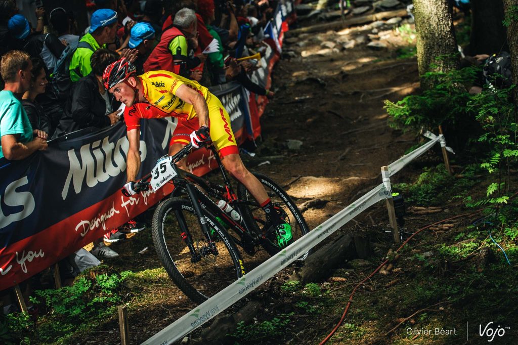 De son côté, Jordan Sarrou a bien maîtrisé son sujet. Après un mondial malheureux à Vallnord l’an dernier, le jeune Français termine cette fois 13e. « J’ai fait une bonne course. J’aurais pu rêver de top 10, mais c’était un peu au-dessus de mes forces. Quand Maxime m’a passé, je n’ai pas pu m’accrocher. Je me suis aussi parfois retrouvé seul entre deux groupes dans la longue portion roulante autour de l’arrivée. Mais j’ai emmagasiné pas mal d’expérience et ce résultat m’encourage vraiment pour la suite. »