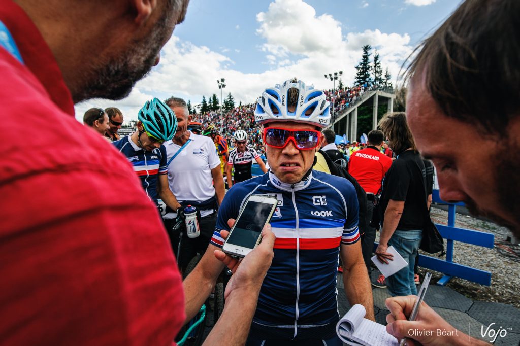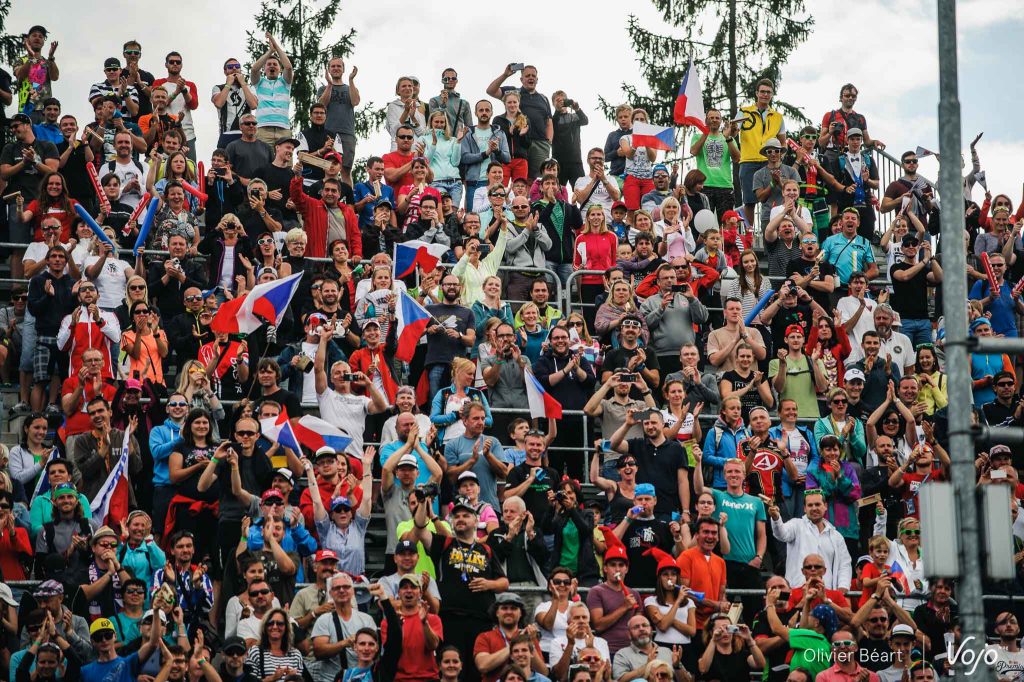 Au 4e tour, quand Nino Schurter s’envole définitivement, Julien Absalon se retrouve avec Jaroslav Kulhavy. « C’est une situation un peu inédite, s’amuse Absalon. Je me bats très souvent avec Nino, mais je n’avais quasiment jamais roulé comme cela avec Jaro. Soit je suis largement devant, soit c’est lui. C’était très particulier de me retrouver en sa compagnie devant son public. A chaque passage c’était de la folie. C’était même limite oppressant car il y avait du monde vraiment partout et on avait presque du mal à respirer. Il faut aussi rester concentré en ne pas trop en faire car on se laisse vite emporter par autant de cris. »