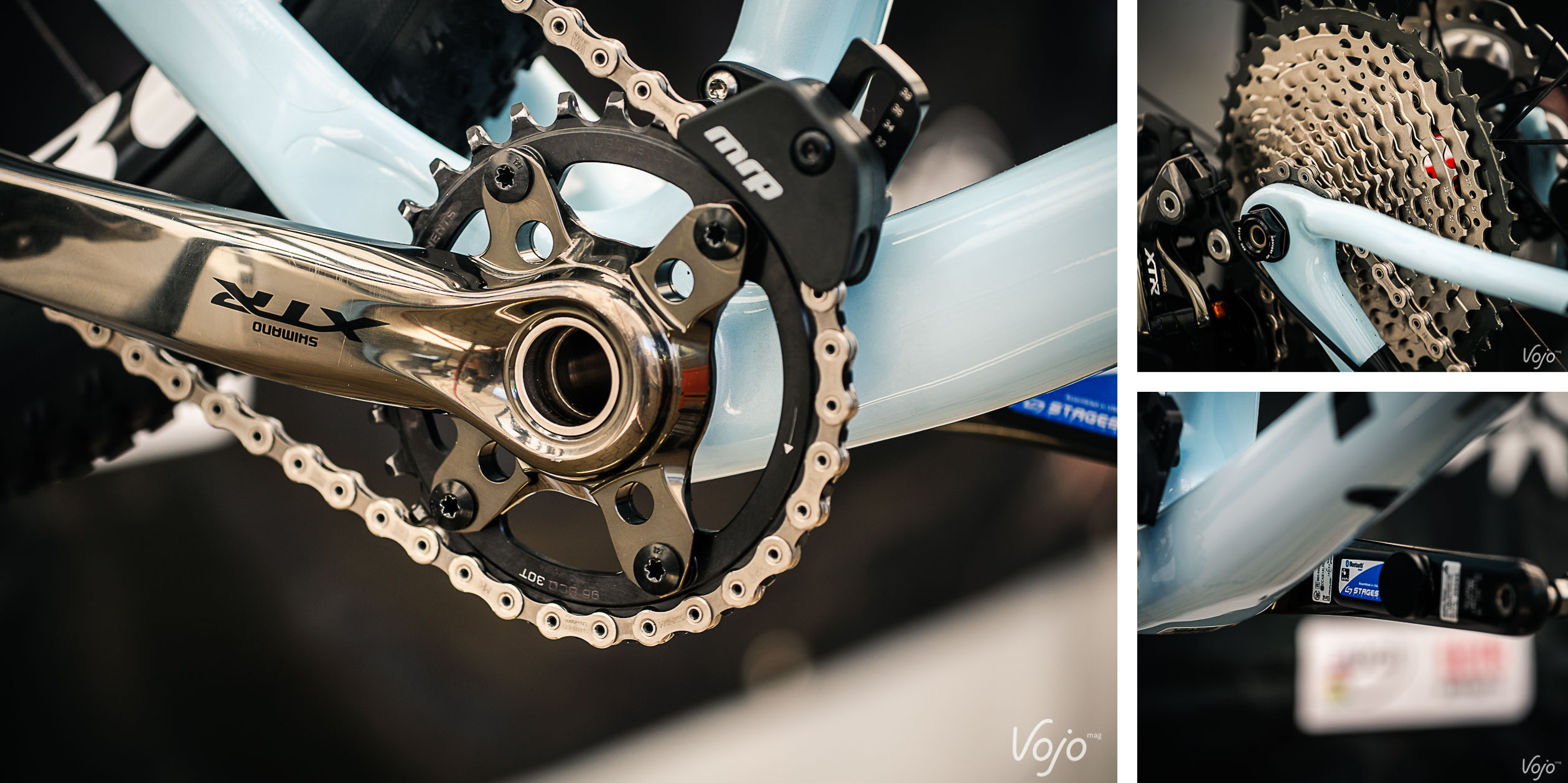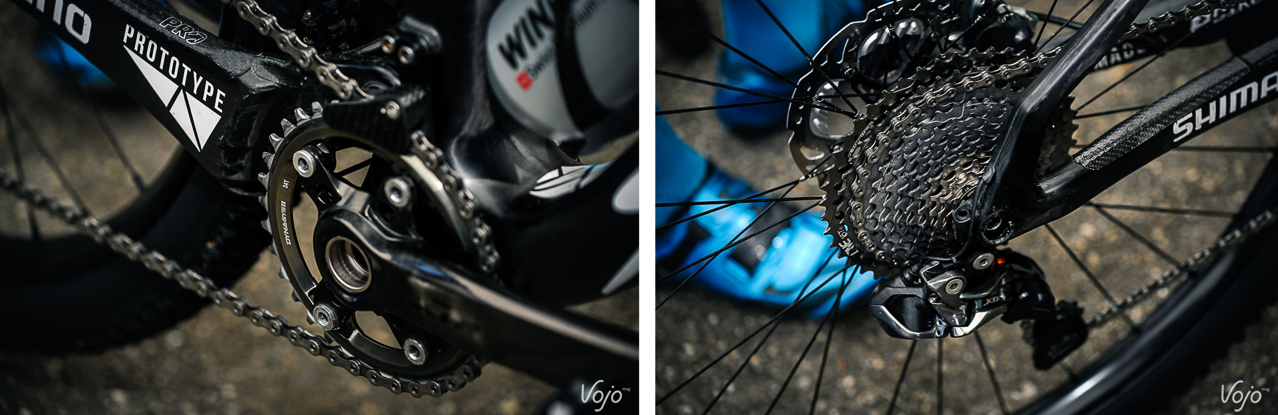Comme Julien Absalon, « Math » dispose du nouveau plateau Shimano DCE en 34 dents, et il roule avec une cassette Shimano XTR couplée à un kit OneUp qui lui permet d’ajouter un pignon de 45 dents en fin de cassette pour avoir plus de marge dans les montées et pouvoir mettre un plateau plus grand pour gagner en vitesse de pointe dans les sprints.