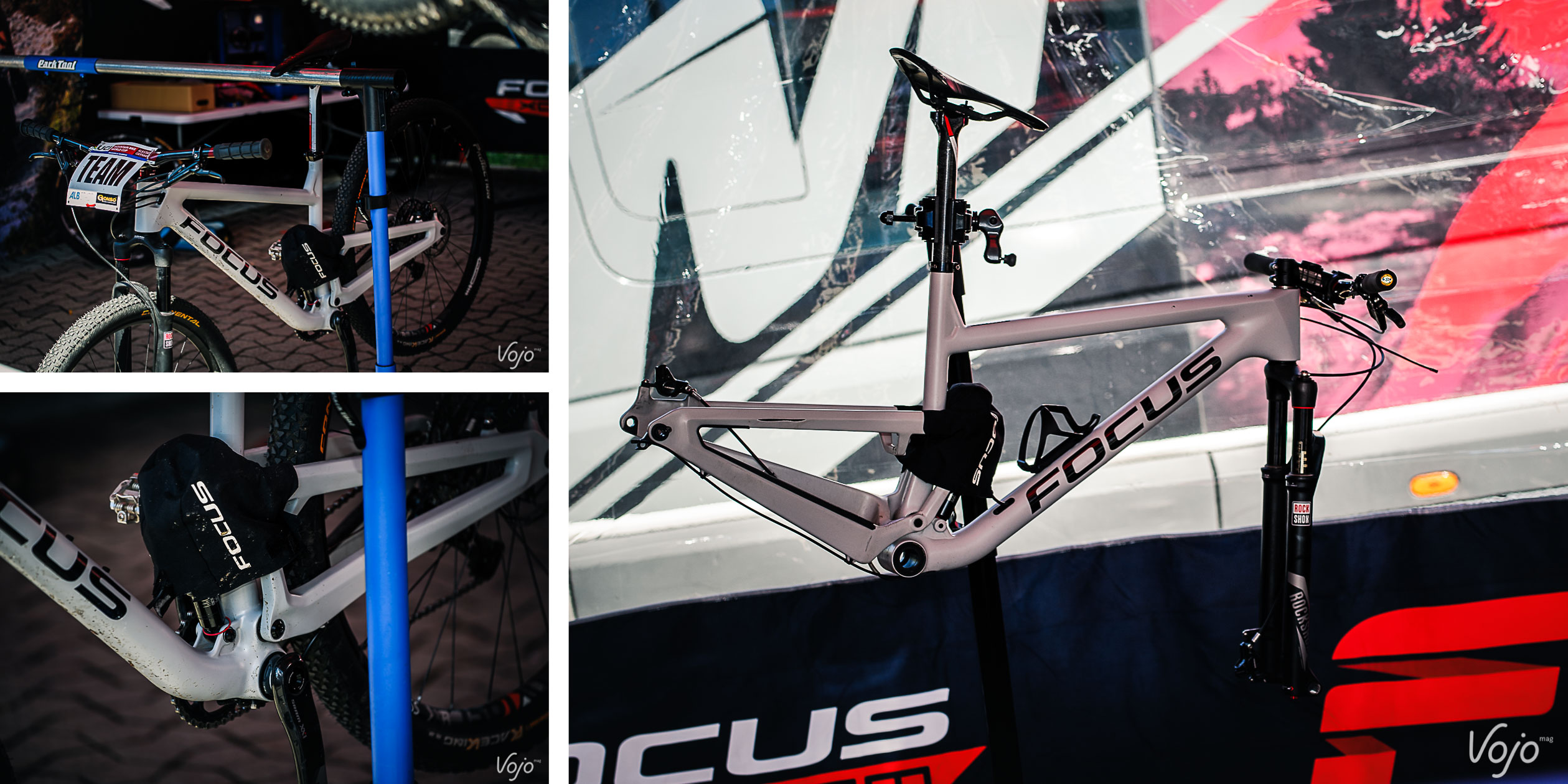 Florian Vogel et son team disposent, en plus du Raven Max semi-rigide, d’un nouveau full suspendu prototype dont nous avons déjà eu l’occasion de vous parler. Il dispose toujours d’une « chaussette » au niveau de la biellette pour cacher cette partie de la suspension, mais d’après nos informations, elle devrait être enlevée d’ici aux championnats du Monde de Nove Mesto.