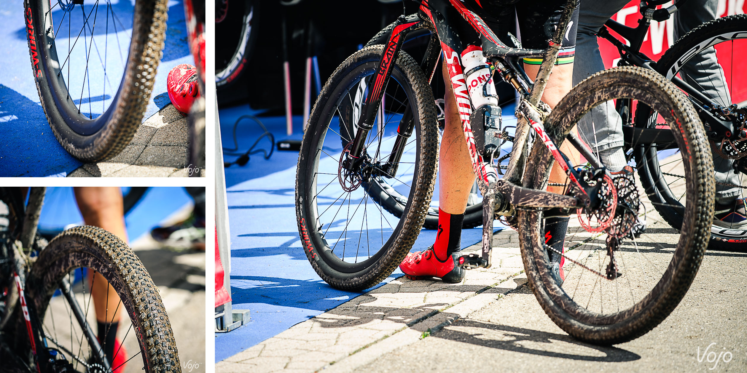 Nous avons aussi eu l’oeil attiré par des jantes très larges sur le vélo de Christof Sauser qui, malgré sa retraite sportive, continue de tourner sur les circuits en qualité de coach technique/ouvreur pour les pilotes du team. Il y a quelques similitudes avec les Roval Traverse, notamment au niveau de la largeur qui semble tourner autour de 30mm, mais le profil est différent, avec des jantes qui apparaissent comme plus rondes.