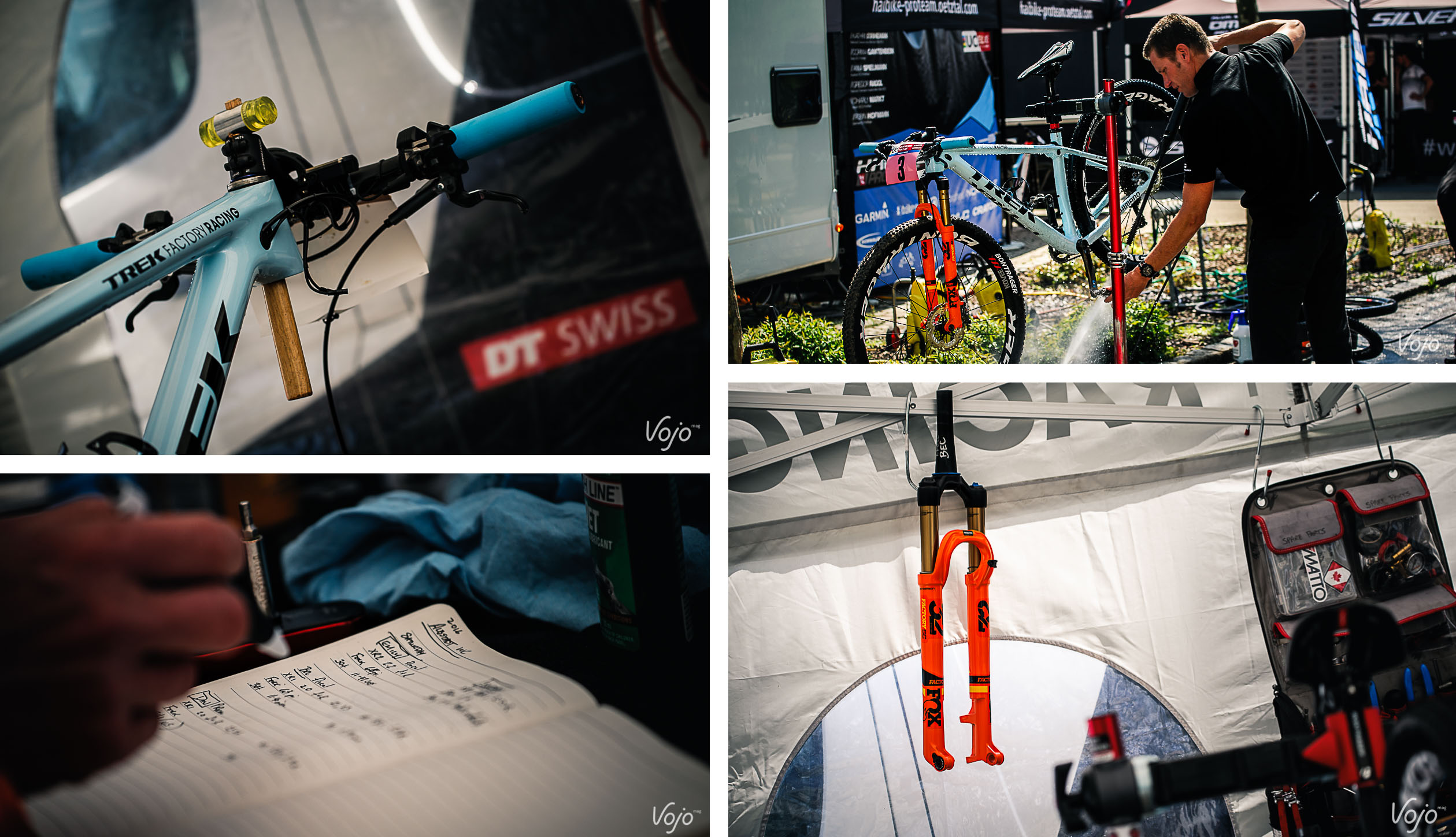 En discutant avec son mécano, nous avons échangé à propos de quelques-uns de ses petits trucs pour se faciliter la vie à l’atelier. Quand une fourche est retirée, il se sert du manche d’un maillet pour maintenir le poste de pilotage en place. Toutes les pièces importantes comme les roues ou la fourche sont également marquées au nom des pilotes pour éviter les inversions. Le mécano prend également note de tous les réglages de ses pilotes : pneus choisis, section, pression, pression des suspensions, changements effectués,…