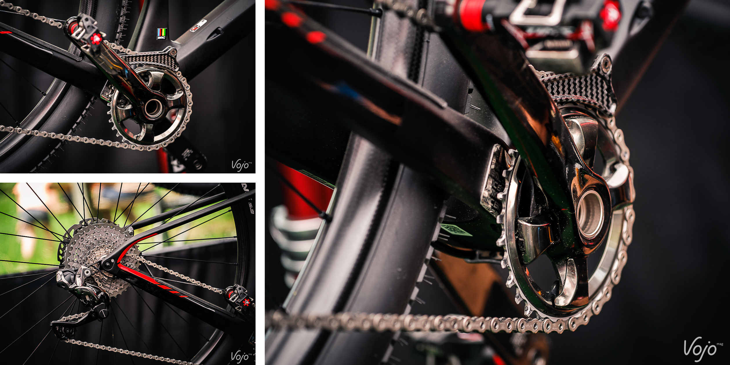 Sur son BMC Team Elite 01, Julien Absalon roule avec la transmission Shimano XTR Di2, qu’il a contribué à développer. La cassette est classique, en 11/40, mais on note la présence d’un plateau Shimano équipé du nouveau design de dents « Dynamic Chain Engagement » dessiné par la marque pour concurrencer le narrow-wide de Sram. Il est en 34 dents. Un anti-déraillement en carbone est placé pour éviter de prendre le risque d’un saut de chaîne.