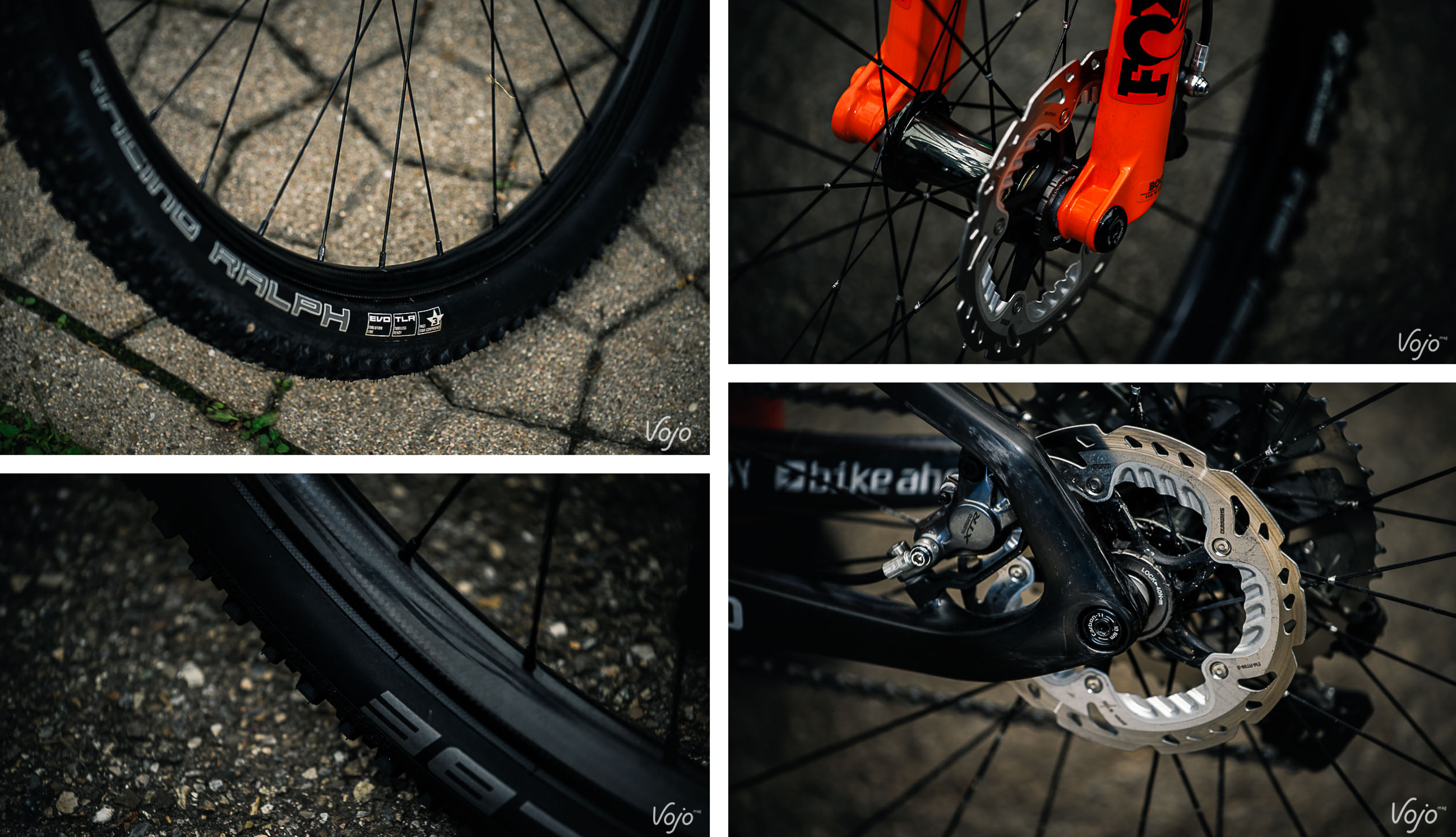 Il y a eu du changement au niveau des roues sur les vélos de Julien Absalon. Exit les jantes alu NoTubes déstickées, place à des Duke Carbone en 25mm de large qui avaient d’ailleurs remporté haut la main notre grand test comparatif en octobre dernier. Les moyeux restent des Shimano XTR (les pilotes Shimano sont, pour la plupart, libres de choisir les jantes qu’ils souhaitent utiliser mais ils doivent continuer à utiliser les moyeux de la marque). Depuis son passage aux jantes larges, Julien Absalon utilise parfois des pneus de plus fine section, comme les Race King 2.0 à Albstadt.