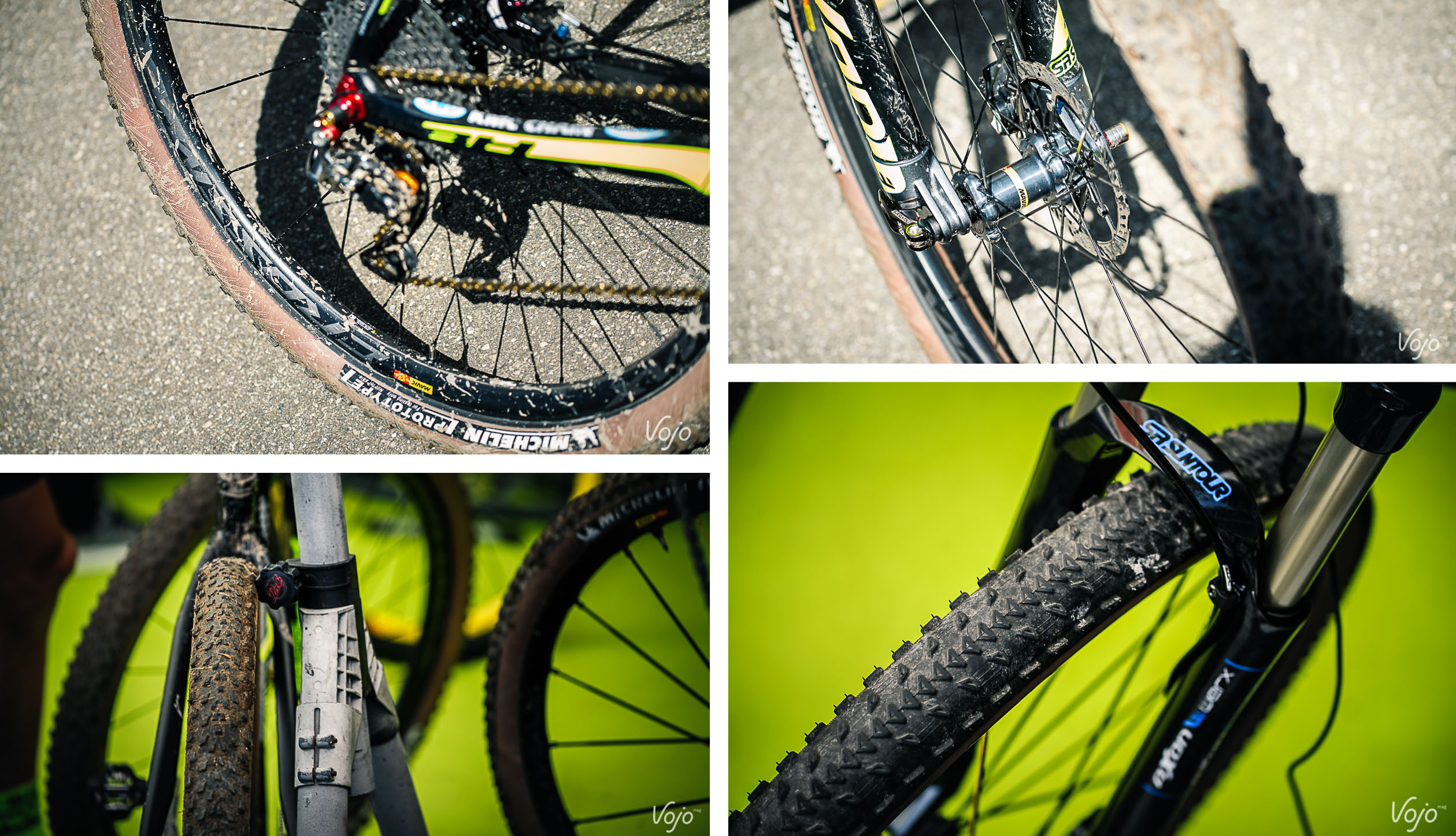 Au niveau des trains roulants, les tests se poursuivent. Avec Mavic d’une part pour les roues, qui sont les nouvelles CrossMax Carbone qui devraient sortir en cours d’année pour faire suite au modèle d’enduro qui vient d’être présenté. Et avec Michelin d’autre part pour les pneus. En plus d’un profil proche de l’Enduro Rear, mais dédié au XC, un autre très roulant est également utilisé avec des crampons triangulaires. Mais c’est aussi la carcasse qui est entièrement neuve et les pilotes nous ont avoué pouvoir rouler à des pressions de l’ordre de 1,1 bar sans ressentir le moindre flou dans les appuis !