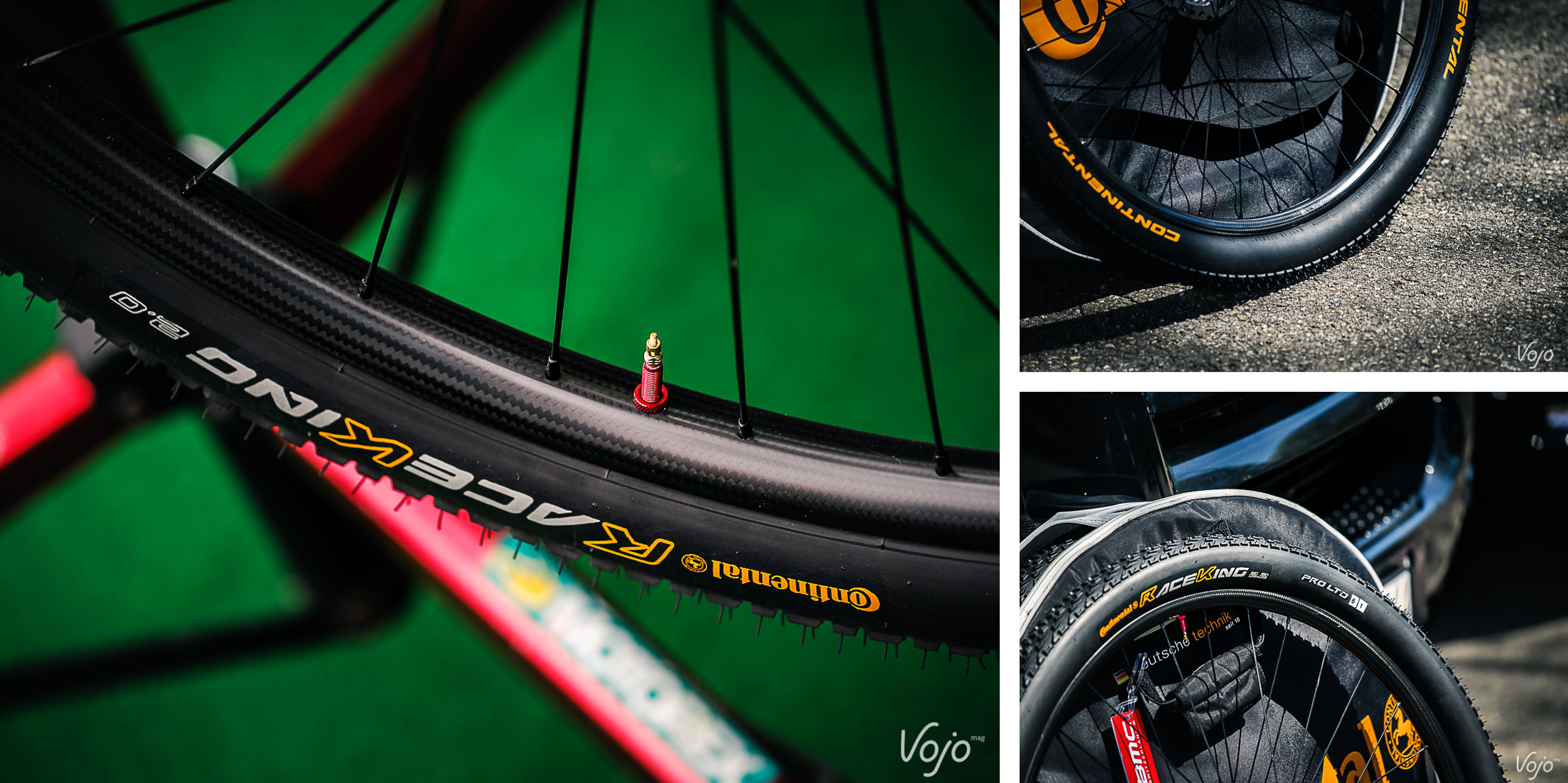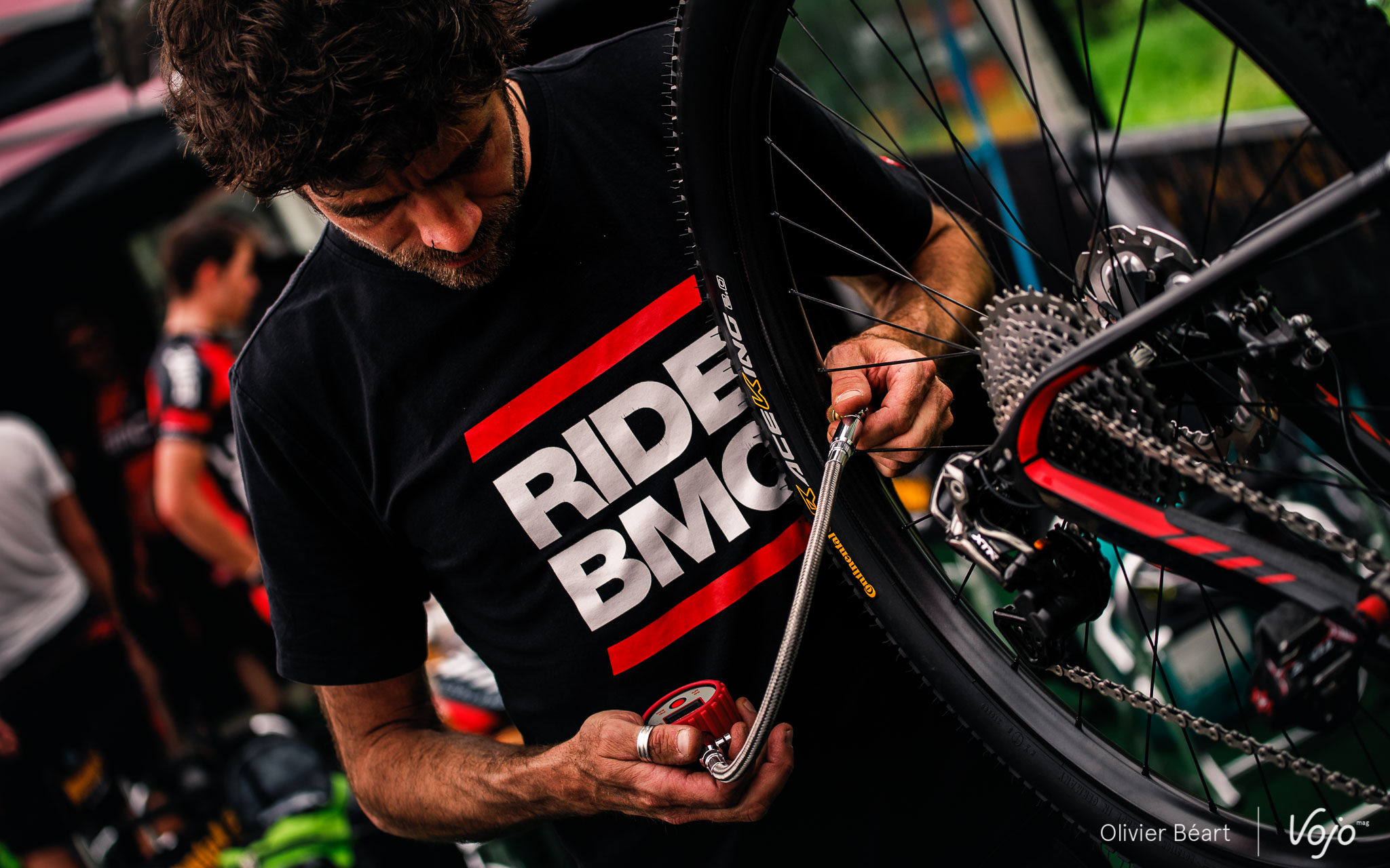 Avant chaque course, alors que le pilote se prépare, la pression des pneus est contrôlée scrupuleusement par le mécano, avec un manomètre de précision (non monté sur une pompe). Julien Absalon roule avec 1.4 bar de pression dans ses Continental Race King. Un profil qu’il roule presque en permanence, mais pour lequel il dispose, en tant que pilote pro, de plusieurs versions de gomme pour s’adapter aux conditions.