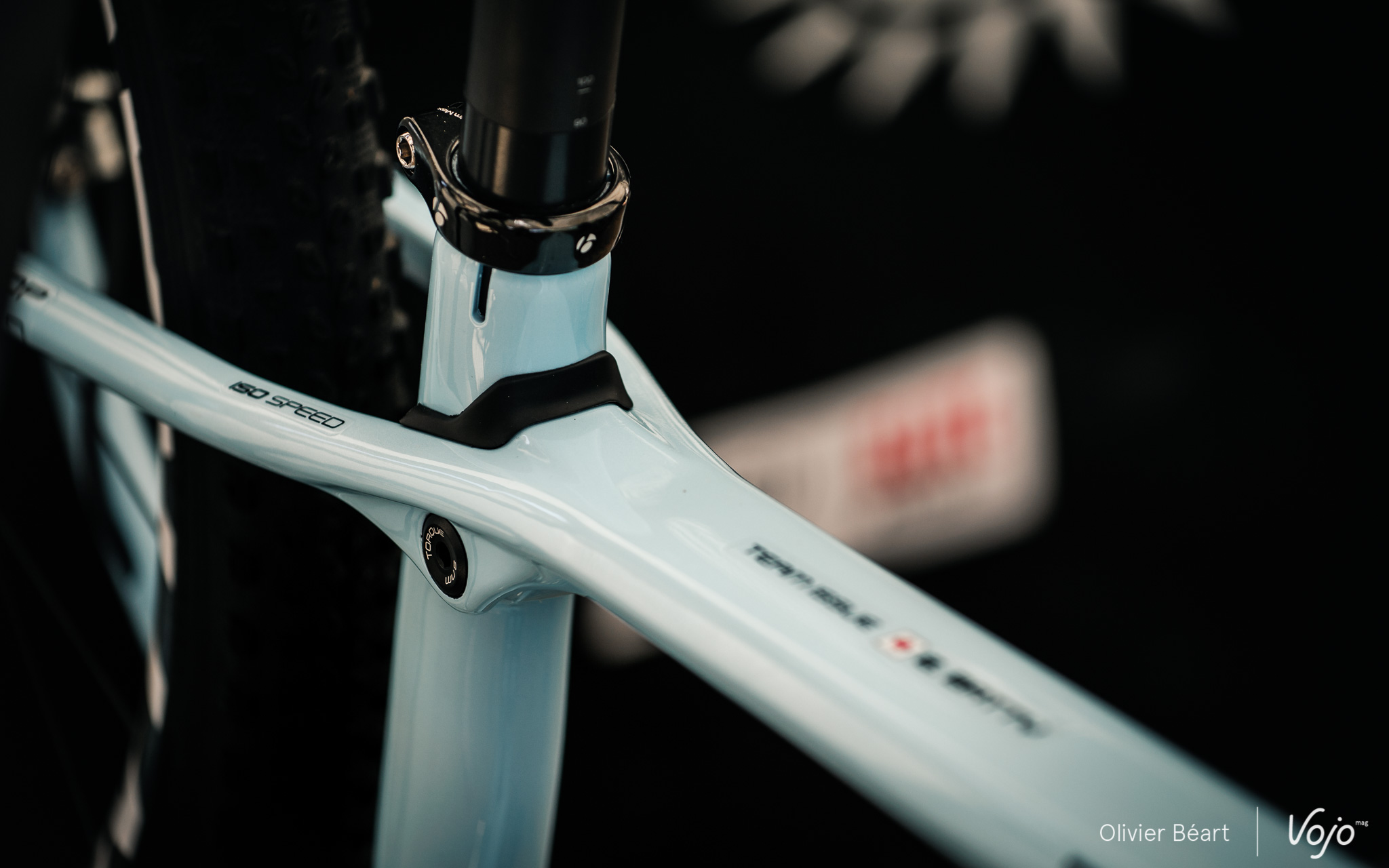 Seul petit souci, sur le BMC Team Elite 01 utilisé à Albstadt, la tige de selle est en diamètre 27,2mm. Julien Absalon n’a donc pas pu utiliser le même modèle KS en carbone que sur son full, avec 70mm de débattement. Qu’à cela ne tienne, il y a dans la gamme du fabricant asiatique un modèle alu en 27,2mm avec passage interne du câble de commande. Pour convenir aux préférences du pilote, des cales ont été installées pour réduire le débattement, qui passe de 100mm d’origine à 65mm une fois modifié.