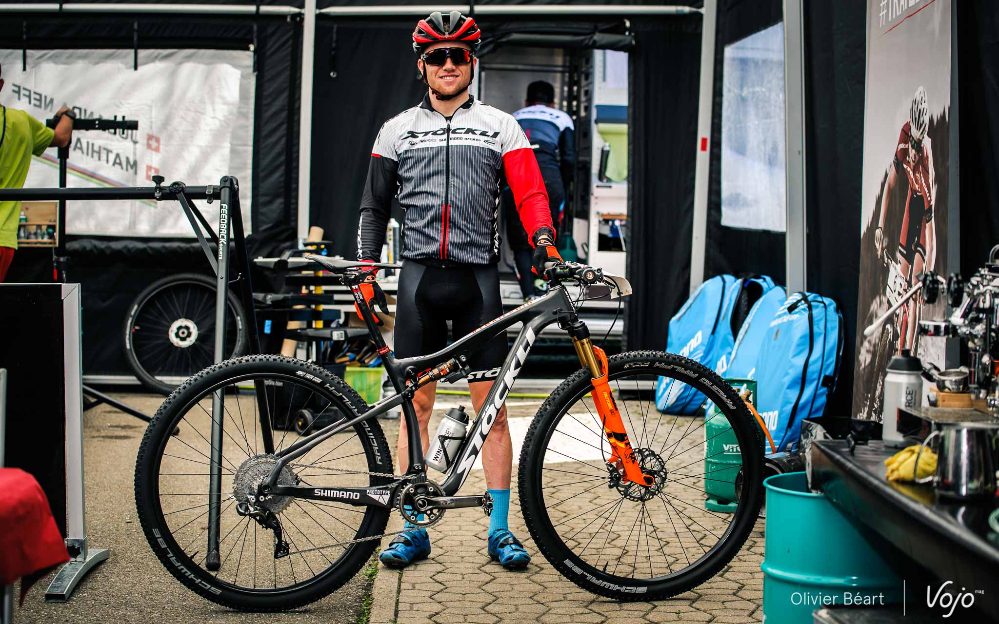 Mathias Flückiger roule sur un cadre Stöckli full suspendu fabriqué en très petite série en Allemagne par le spécialiste des composites Bike Ahead pour la marque suisse. Celui-ci est doté de roues 29 » et suspensions Fox iCTD à blocage électronique, couplées à une transmission Shimano XTR Di2.