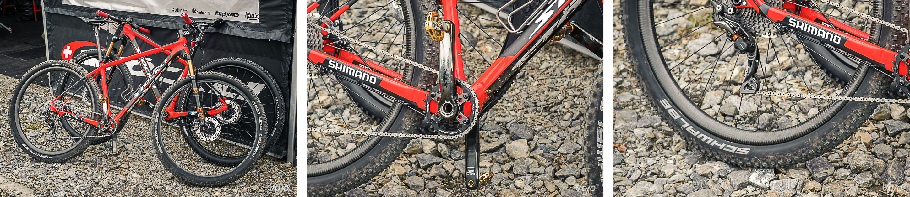 Même topo au niveau des roues : les Shimano XTR d’origine ont un poids qui semble un peu élevé à beaucoup de pilotes et si vous les apercevez sur le vélo de Jolanda Neff en tête d’article, c’est juste pour la photo « officielle » et pour ne pas froisser le sponsor ! En effet, son mécano garde les moyeux XTR, mais opte pour d’autres jantes : Ax-Lightness carbone pour Mathias Flückiger (uniquement sur les terrains roulants comme à Albstadt) ou des jantes en aluminium sans nom apparent mais qui font furieusement penser à des NoTubes Race Gold. Outre leur poids, les pilotes légers et fins apprécient la souplesse de ces jantes qui peut être un atout sur des parcours truffés d’obstacles comme à Nove Mesto. C’était d’ailleurs le choix tant de Flückiger que de Neff en Tchéquie.