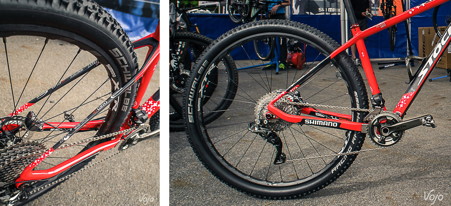 Aussi gentille et disponible que son beau sourire le laisse deviner, Jolanda Neff nous a étonnés par sa connaissance du matériel et l’attention qu’elle porte aux détails. Clairement, elle ne se contente pas de monter sur son vélo et de rouler. Elle s’intéresse vraiment aux aspects techniques et elle connaît sa machine sur le bout des doigts. Elle nous explique : « en arrivant chez Stöckli, j’ai changé de taille de roues, en passant du 27,5 au 29 ». Je mesure 169cm et cela s’est passé sans souci. Le vélo est très facile dans le technique et confortable (voir les haubans très fins ci-dessous, NDLR). Sur les parcours de Coupe du Monde actuels, c’est un gros atout en franchissement. Chose très importante, je suis restée chez Shimano et j’avais donc déjà pu m’habituer au XTR Di2 dont j’apprécie la souplesse de fonctionnement. »