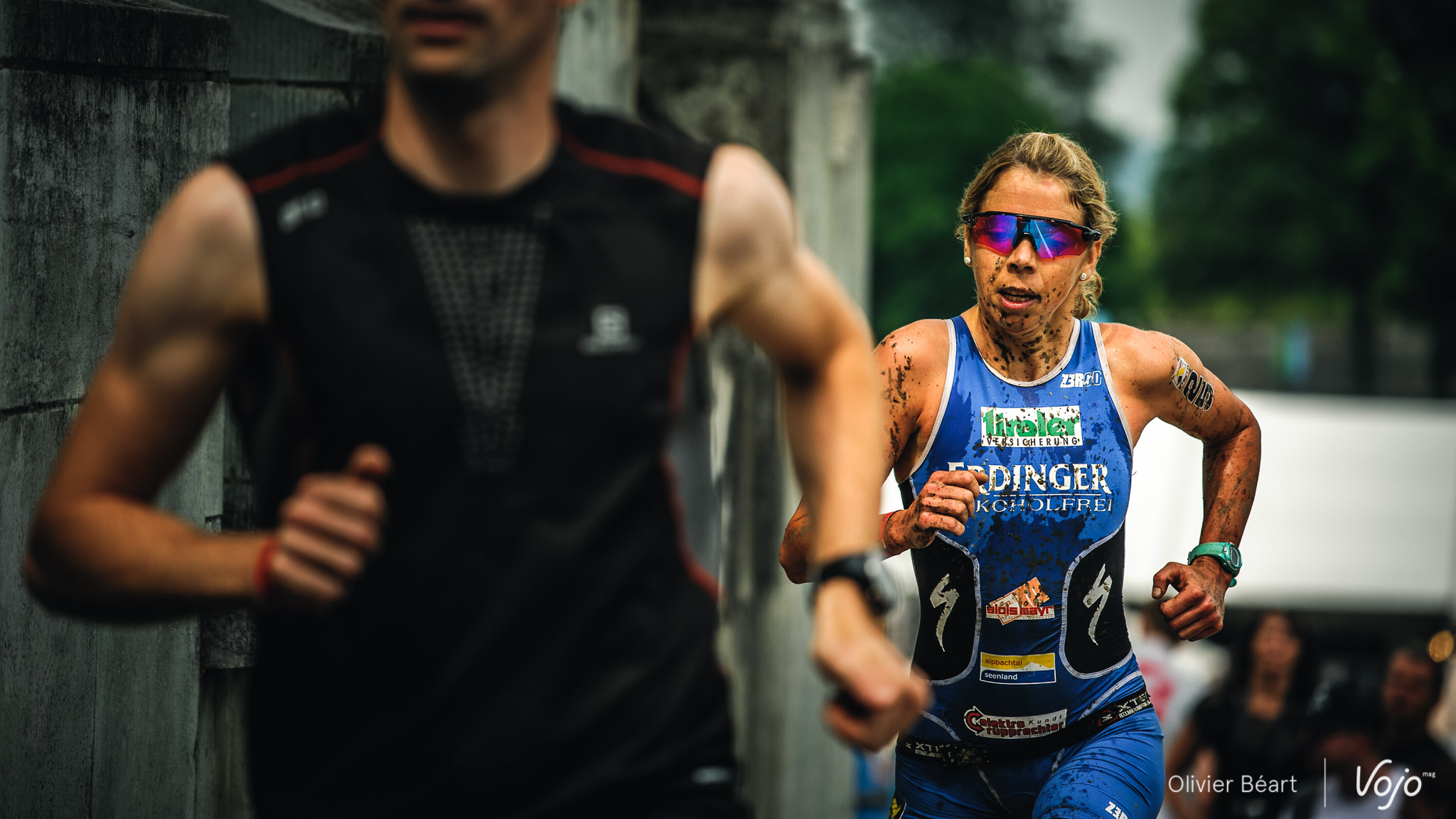 Juste derrière, le sympathique Kris Coddens (en haut) gère sa course à pied, placé à quelques mètres seulement de la tête. Champion d’Europe de duathlon par le passé, ce format sans natation n’est pas pour lui déplaire. Chez les Dames (image de droite), la star Héléna Herbenova prend déjà les commandes en se situant dans le top 50 scratch.